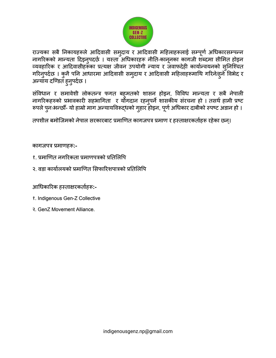 विज्ञप्तिमा भनिएको छ, ‘आदिवासी महिला र नागरिकहरूलाई सम्पूर्ण अधिकारसम्पन्न नागरिकको मान्यता दिनुपर्छ । यस्ता अधिकारका कानुनी क्षेत्रमा सीमित होइन व्यवहारिक र आदिवासीहरूका प्रत्यक्ष जीवनमा न्याय र जवाफदेही कार्यान्वयन सुनिश्चित गरिनुपर्छ । कुनै पनि आधारमा आदिवासी समुदाय र आदिवासी महिलाहरूमाथि गरिने-हुने विभेद र अन्याय दण्डित हुनुपर्छ ।’