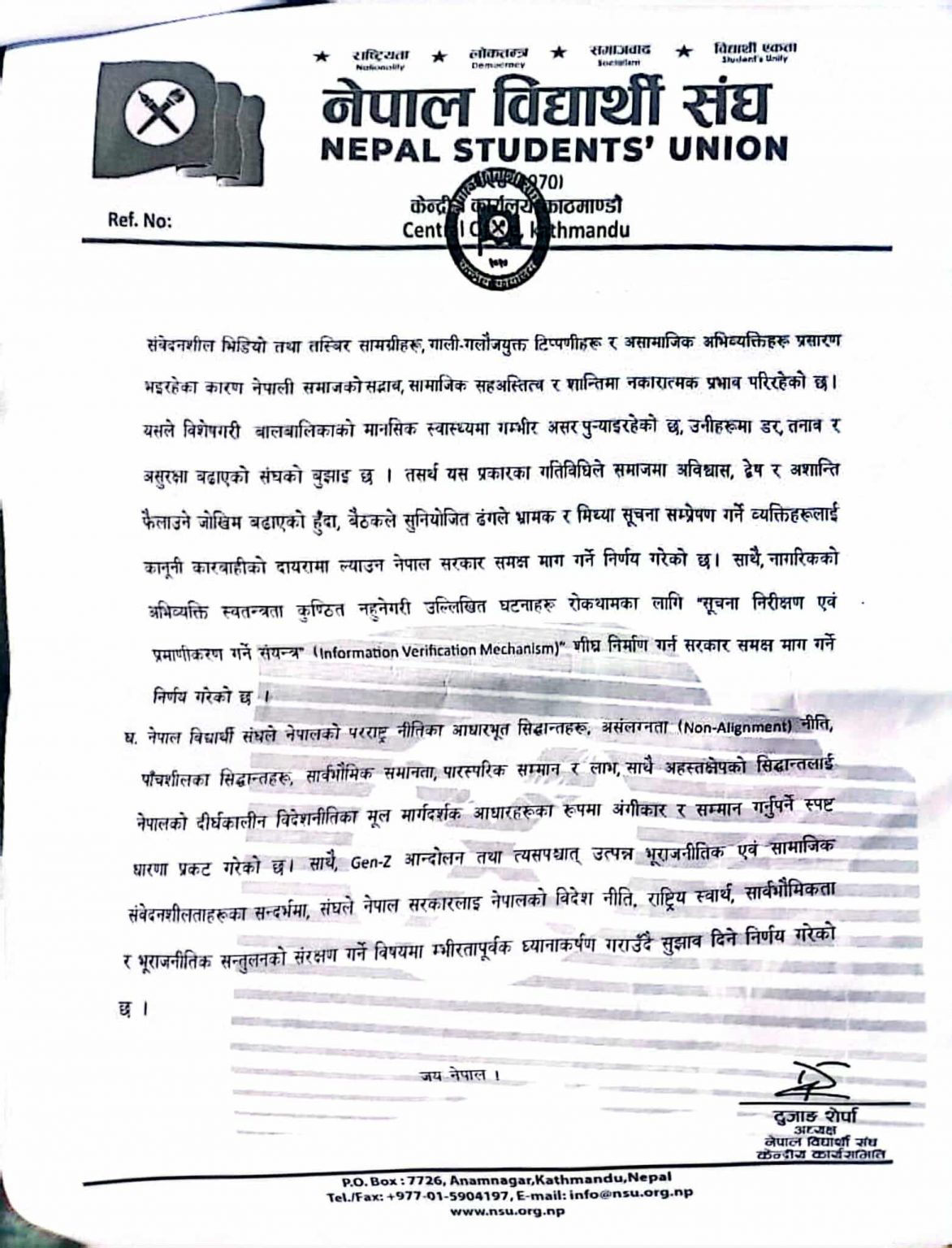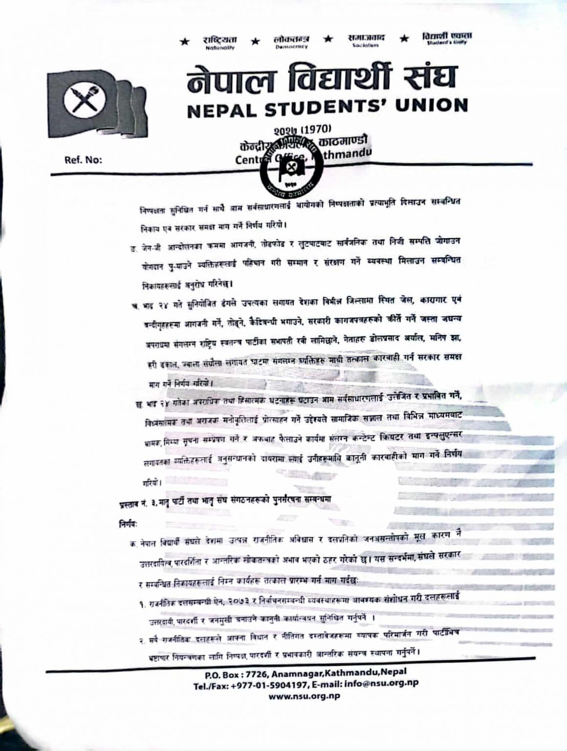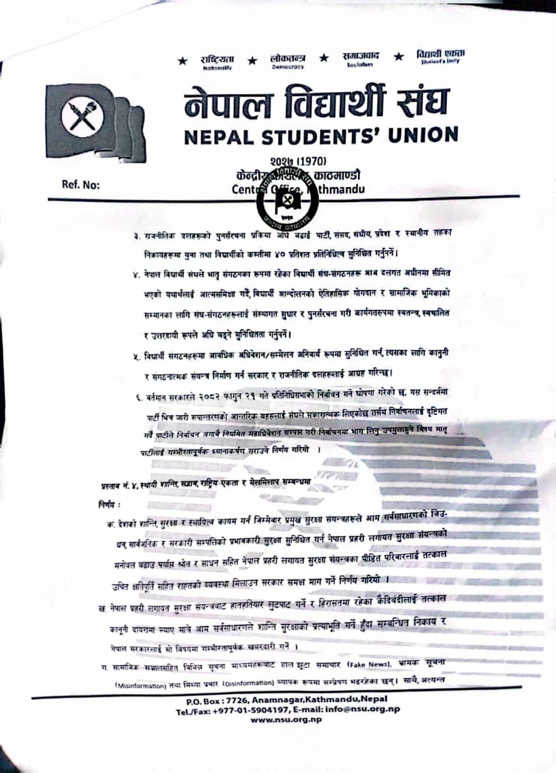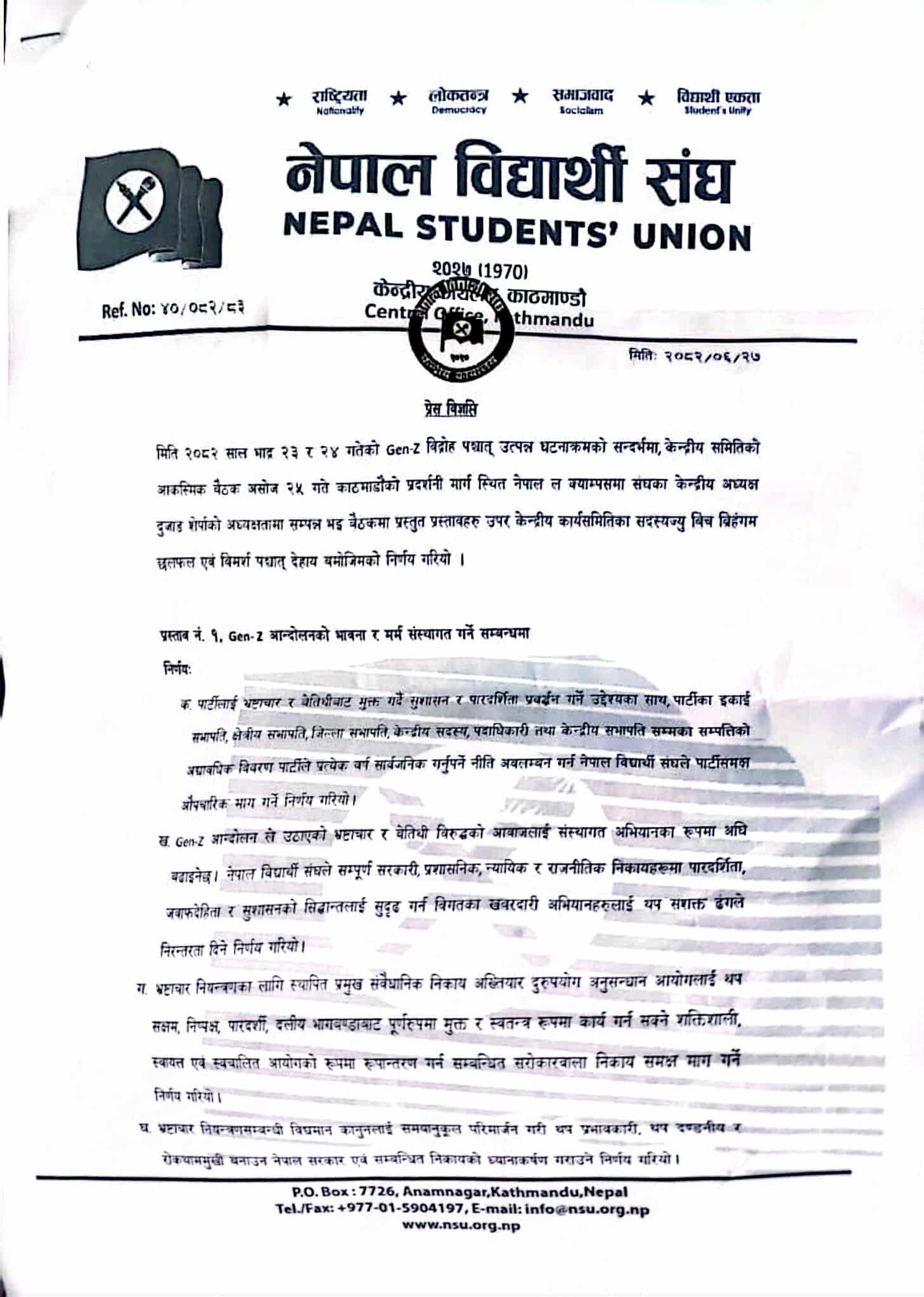 ‘वर्तमान सरकारले २०८२ फागुन २१ गते प्रतिनिधि सभाको निर्वाचन घोषणा गरेको छ, यस सन्दर्भमा पार्टीभित्र जारी रूपान्तरणको आन्तरिक बहसलाई संघले सकारात्मक लिएको छ, तसर्थ निर्वाचनलाई दृष्टिगत गर्दै पार्टीले निर्वाचन अगावै नियमित महाधिवेशन सम्पन्न गरी निर्वाचनमा भाग लिनु उपयुक्त हुने विषय मातृ पार्टीलाई गम्भीरतापूर्वक ध्यानाकर्षण गराउने निर्णय गरियो,’ अध्यक्ष दुजाङ शेर्पाले आज जारी गरेको विज्ञप्तिमा उल्लेख छ । उनले जेनजीले उठाएको मागलाई अब संस्थागत रूपमा उठाउने पनि बताएका छन् । राजनीतिक दलहरूको पुनर्संरचना गरी पार्टी, संसददेखि स्थानीय तहसम्म ४० प्रतिशत युवा सुनिश्चित हुनुपर्ने माग अघि सारेको छ ।