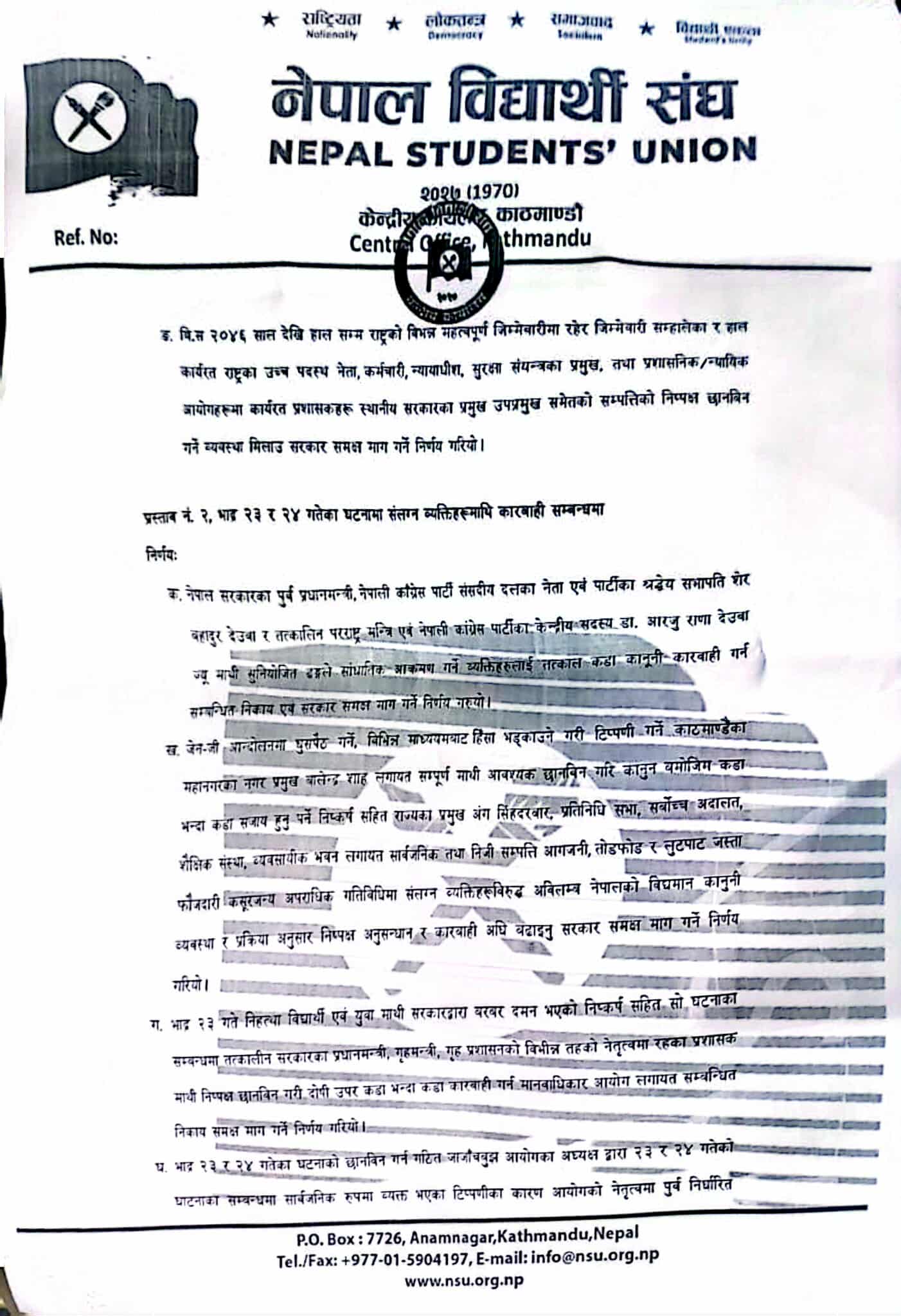 नेविसंघले काठमाडौं महानगरपालिकाका मेयर बालेन शाहमाथि आवश्यक छानबिन गरी कारबाहीको माग गरेको छ । जेनजी पुस्ताको आन्दोलन घुसपैठ गर्ने, विभिन्न माध्यमबाट हिंसा भड्काउने गरी मेयर शाहलगायतले टिप्पणी गरेकोले छानबिन आवश्यक परेको नेविसंघको भनाइ छ । जेनजी आन्दोलनपछिको परिस्थितिबारे जानकारी दिन आयोजित पत्रकार सम्मेलनमा अध्यक्ष दुजाङ शेर्पाले पार्टी सभापति देउवा र पत्नी आरजु राणामाथि सुनियोजित रूपमा हमला गरेको भन्दै कारबाहीको माग गरेका छन् ।