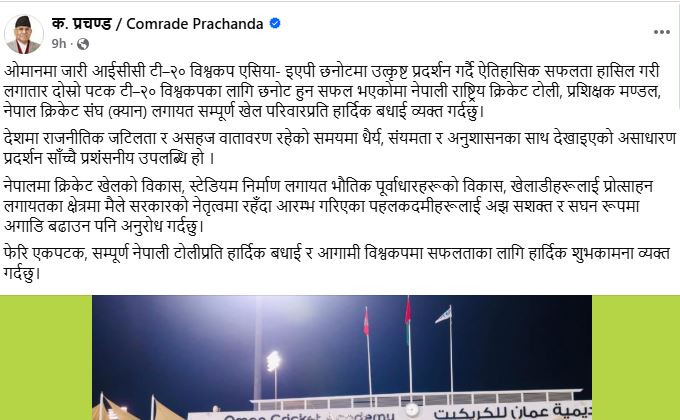 काठमाडौं । माओवादी केन्द्रका अध्यक्ष तथा पूर्वप्रधानमन्त्री पुष्पकमल दाहाल ‘प्रचण्ड’ले ओमानमा जारी टी–२० विश्वकप एसिया–इएपी छनोटमा उत्कृष्ट प्रदर्शन गर्दै लगातार दोस्रो पटक टी–२० विश्वकपमा स्थान सुरक्षित गरेको नेपाली राष्ट्रिय क्रिकेट टोलीलाई बधाई दिएका छन् ।