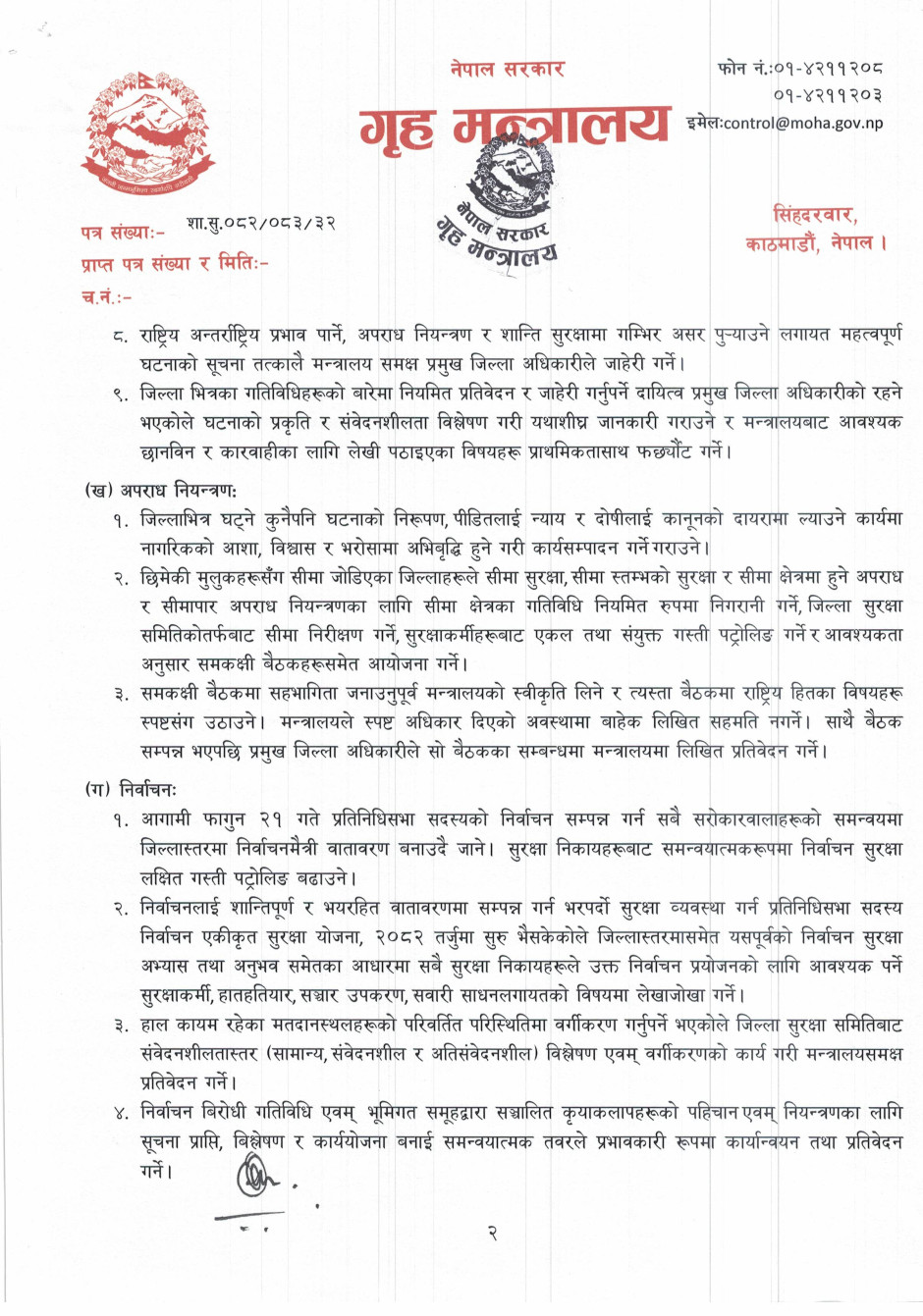 ७ पेज लामो ११ फरक विषयहरुमा मन्त्रालयले दिएको निर्देशनमा निर्वाचन सुरक्षाका विषयहरु पनि औंल्याइएको छ । जहाँ २१ फागुनमा हुने प्रतिनिधि सभा चुनावका लागि सबै सरोकारवालहरुसँगको समन्वयमा जिल्लास्तरमा निर्वाचनमैत्री वातारण बनाउँदै लैजानुपर्ने उल्लेख गरिएको छ ।