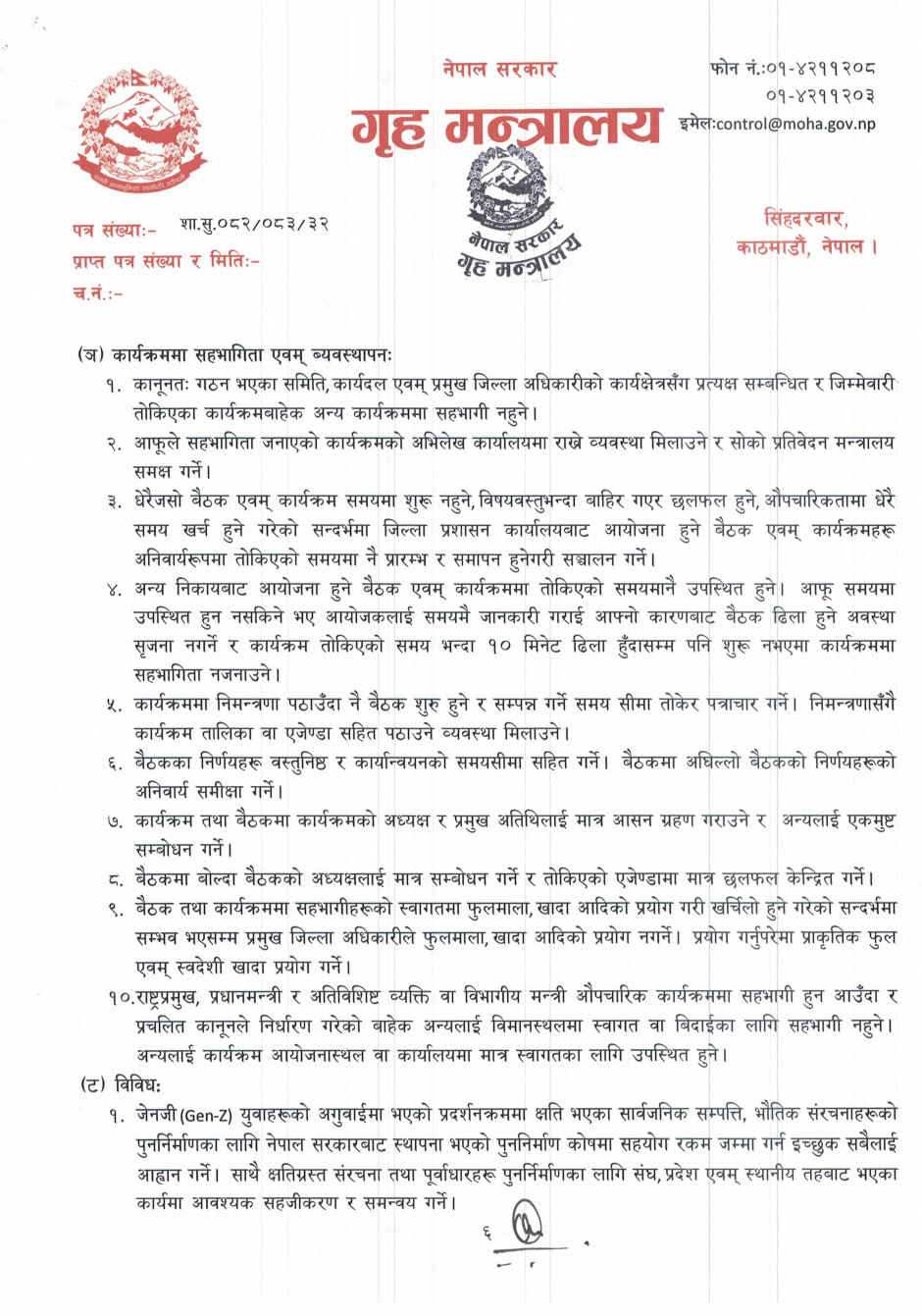 काठमाडौं । गृह मन्त्रालयले देशभरका जिल्ला प्रशासन कार्यालय (सीडीओ) कार्यालयहरुलाई ११ फरक विषयहरूमा ६३ बुँदे निर्देशन दिएको छ । शान्ति सुरक्षा तथा अपराध अनुसन्धान, सुशासन, नियमन, समन्वय र सार्वजनिक सेवा प्रवाह सहजीकरण, निर्वाचन सुरक्षा लगायतका विषयमा निर्देशन दिएको हो । जेनजी आन्दोलनपछि तत्काल र दीर्घकालीन रुपमा देखा पर्ने सुरक्ष चुनौतीहरु पहिचान र विश्लेषण गर्ने, त्यसका लागि सूचना संकलन गर्ने निर्देशन दिएको छ ।