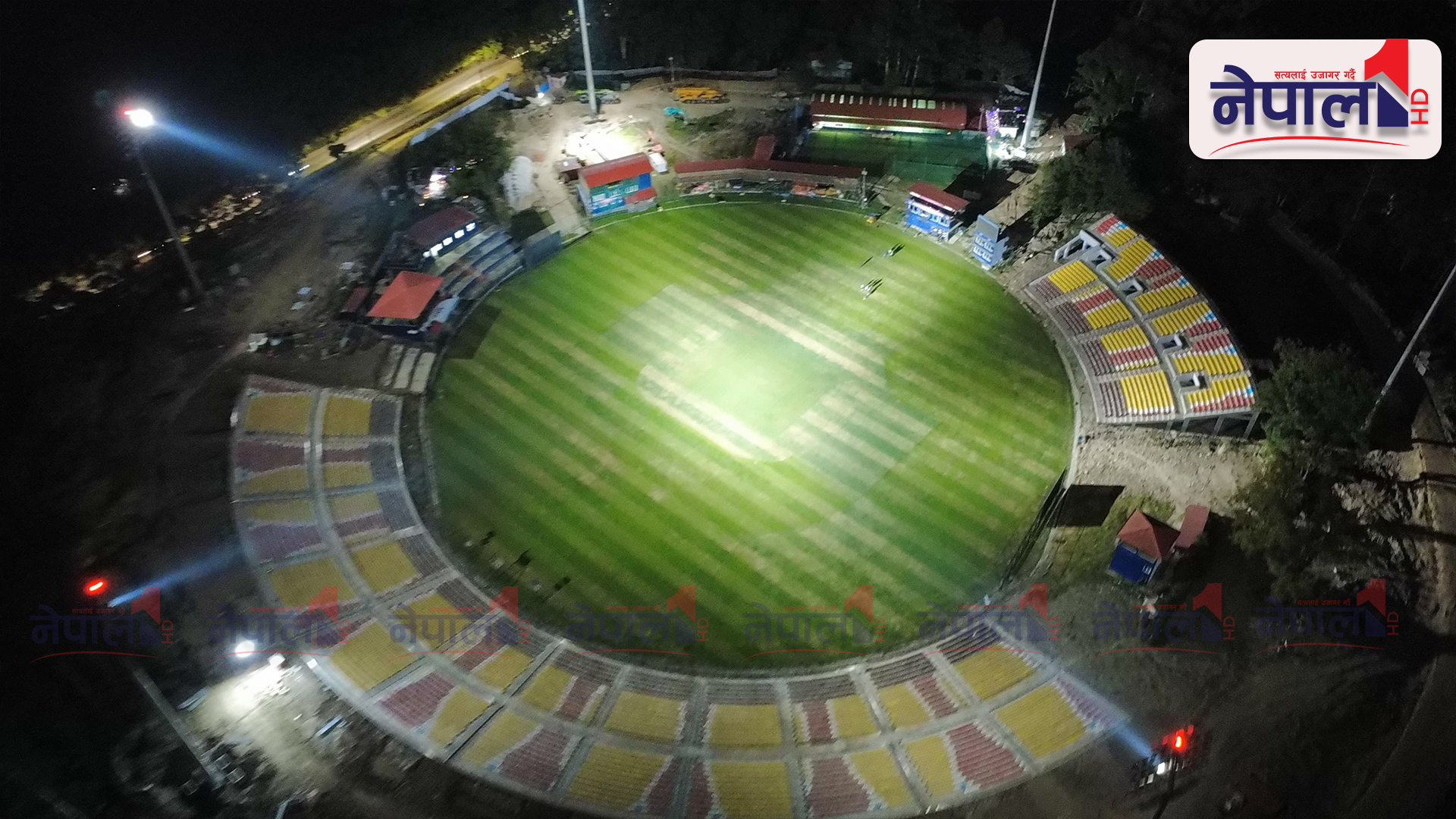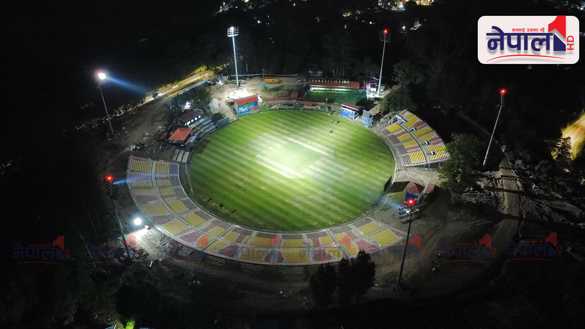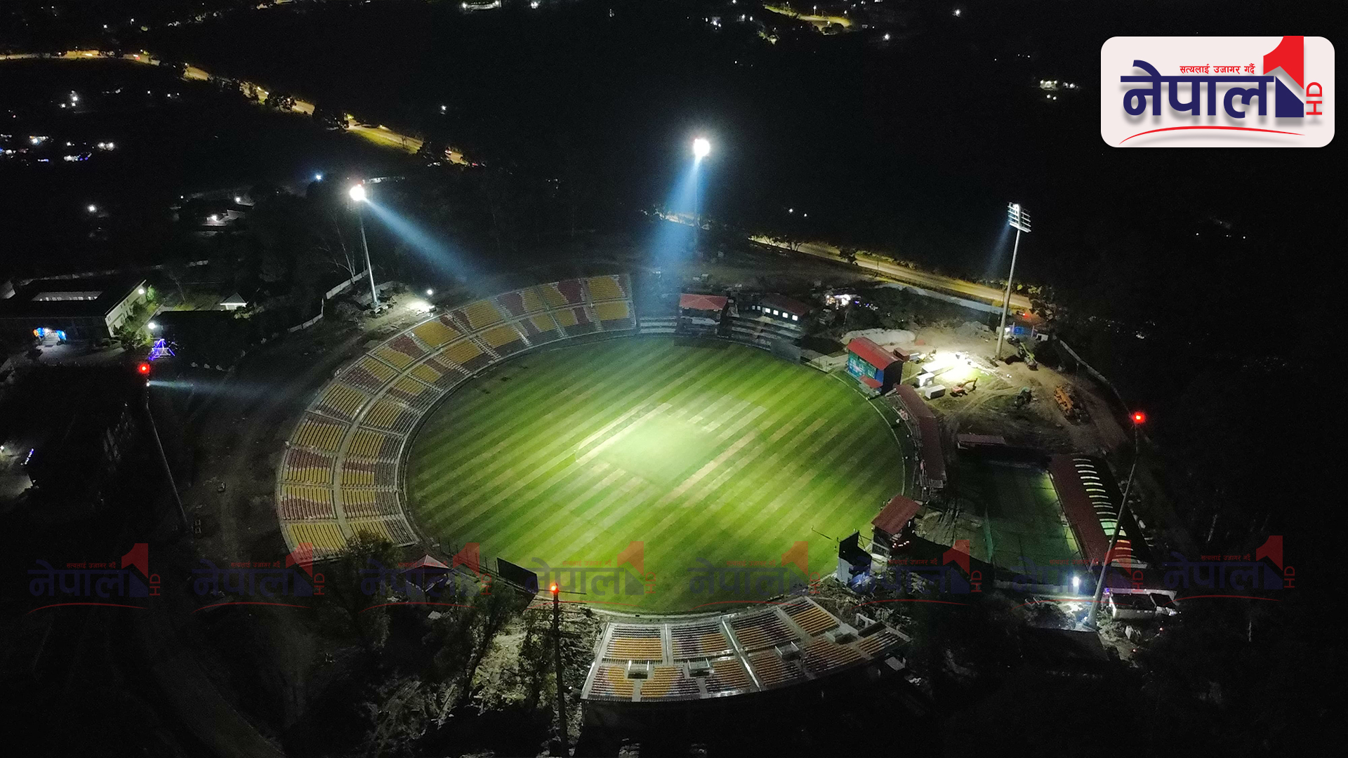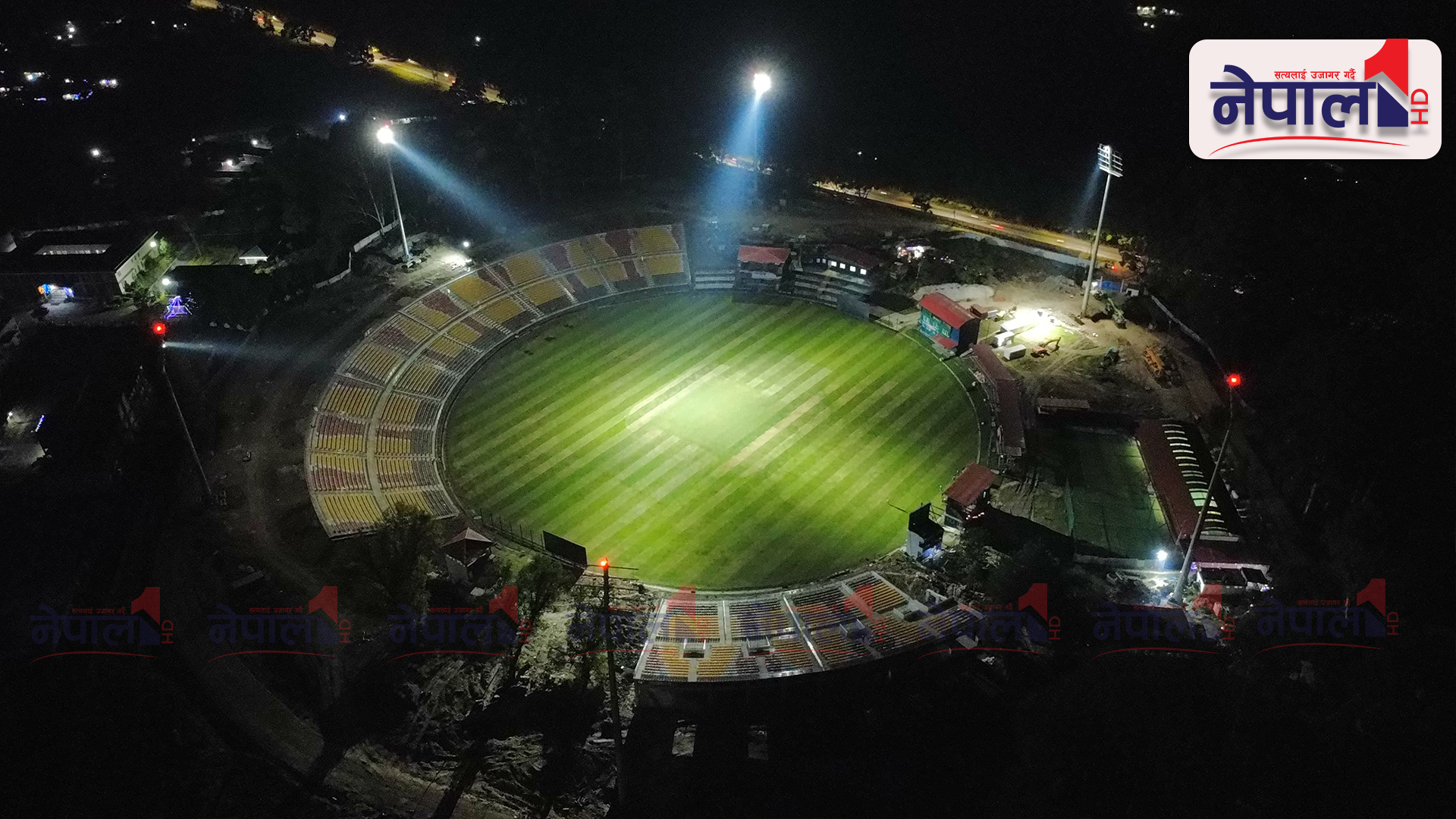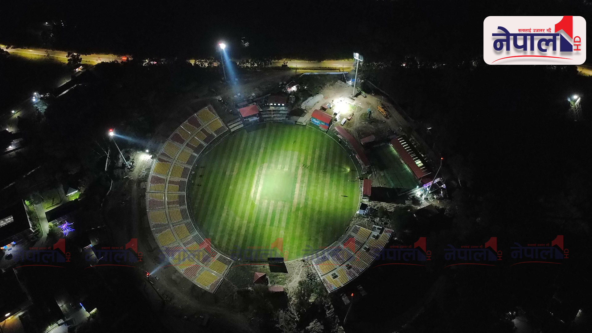 चारवटा हाइमस्ट पोलबाट बत्ति बलेपछि त्रिवि त्रिकेट मैदान झलमल्ल भएको छ।