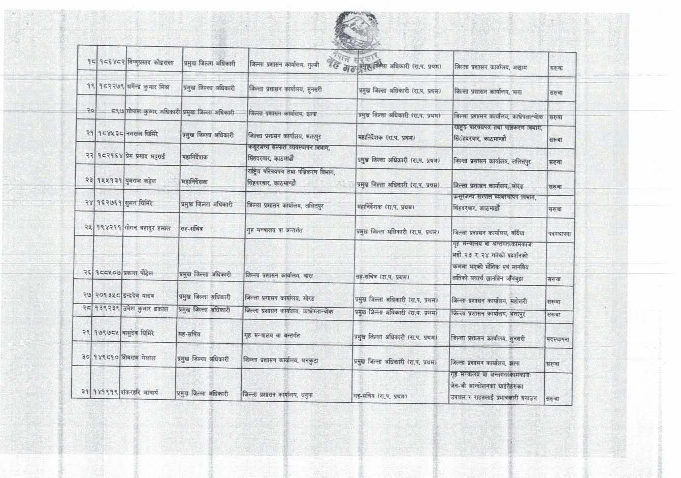 गृहको कसुरजन्य सम्पत्ति व्यवस्थापन विभागका महानिर्देशक प्रेमप्रसाद भट्टराईलाई ललितपुरको प्रजिअमा पठाइएको छ भने ललितपुरका प्रजिअ सुमन घिमिरेलाई सोही विभागमा ल्याइएको छ । रुपन्देही, कैलाली, नवलपरासी, महोत्तरी, दोलखा, पर्सा, उदयपुर, डडेलधुरा, लमजुङ, बाँके, बर्दिया, जुम्ला, अर्घाखाँची, रौतहट, कपिलवस्तु, सिन्धुली, अछाम, गुल्मी, सुनसरी, ललितपुर, भक्तपुर, मोरङ, झापा, काभ्रे, बारा, धनकुटा, धनुषा, मकवानपुर, गोरखा, सर्लाही र सिरहाका प्रजिअको सुरुवा गरिएको मन्त्रालयको सूचनामा उल्लेख छ ।