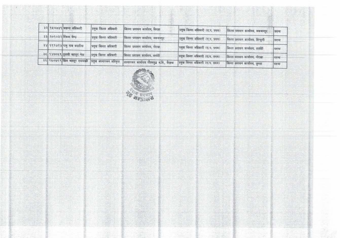 मन्त्रालयले आज साँझ जारी गरेको सूचनामा कुल ३१ प्रमुख जिल्ला अधिकारी, एक प्रमुख अध्यागमन अधिकृत, दुई सहसचिव र दुई महानिर्देशकको सरुवा तथा पदस्थापन गरिएको जनाएको छ ।