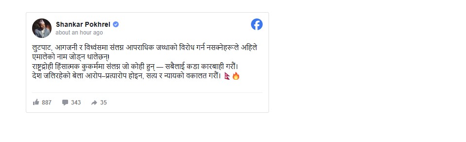 कांग्रेस महामन्त्री थापाले जेनजी आन्दोलनका क्रममा भएको लुटपाट, आगजनी र विध्वंसमा संलग्न आपराधिक जत्थाको विरोध सार्वजनिक रूपमा अझै गरेका छैनन् । महासचिव पोखरेलले राष्ट्रद्रोही हिंसात्मक कुकर्ममा संलग्न जोकोही भए पनि सबैलाई कडा कारबाही गर्नुपर्ने बताएका छन् । उनले लेखेका छन्, ‘राष्ट्रद्रोही हिंसात्मक कुकर्ममा संलग्न जोकोही भए पनि सबैलाई कारबाही गरौँ । देश जलिरहेको बेला आरोप–प्रत्यारोप होइन, सत्य र न्यायको वकालत गरौँ ।’