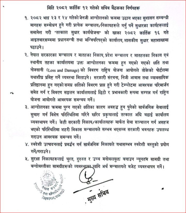 प्रधानमन्त्री कार्यालयले सार्वजनिक गरेको सचिवहरूको कार्तिक १२ गते मंगलवार बसेको बैठकको निर्णयमा २०८२ भाद्र २३ र २४ गते भएको जेन—जी आन्दोलनपछि उठान भएका मागहरू सम्बोधन गर्नका लागि आवश्यक सुधारका कार्यहरू समावेश गरी कार्ययोजनाको खाका आगामी कार्तिक १६ गते आइतबारसम्म शासकीय सुधार महाशाखामा पठाउन उल्लेख छ ।