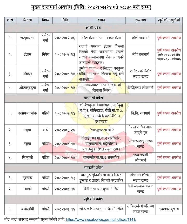 ओखलढुंगाको मानेभञ्ज्याङस्थित सिद्धिचरण राजमार्ग अवरुद्ध रहेको प्रहरीले जनाएको छ । यस्तै बागमती प्रदेशस्थित काभ्रेमा बीपी राजमार्ग, रसुवामा पासाङल्हामु सडक र नेपाली–चीन जोड्ने सडक, सिन्धुलीको मध्यपहाडी लोकमार्ग अवरुद्ध छ । गण्डकी प्रदेशको मुस्ताङस्थित जोमसोम–कोरोला सडक र म्याग्दीको बेनी–दरवाङ सडक पूर्णरुपमा अवरुद्ध रहेको प्रहरीले जनाएको छ । पहिरोका कारण अवरुद्ध भएको अर्घाखाँची सन्धिखर्क नगरपालिका–६ माथिल्लो रिब्दीस्थित सन्धिखर्क–गोरुसिंगे सडक एकतर्फी सञ्चालनमा आएको प्रहरीले जनाएको छ ।