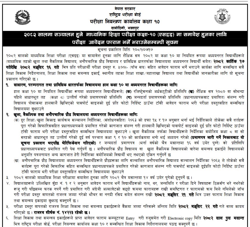 कार्यालयले आज सूचना जारी गर्दै एसईई परीक्षामा सहभागी हुनको लागि कक्षा १० माध्ययनरत विद्यार्थीहरूले आजदेखि आगामी मंसिर १७ गतेसम्ममा फारम भर्न सक्ने जनाएको छ । आवेदन फारम दस्तुर पाँचसय रुपैयाँ तोकिएको छ ।