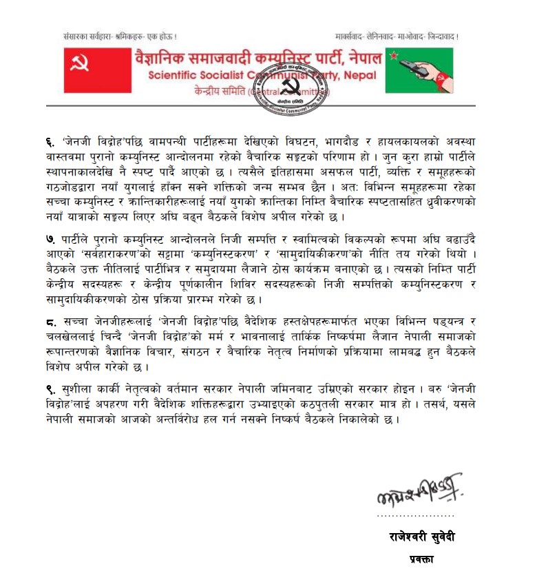 ‘जेनजी विद्रोह’पछि उत्पन्न नेपाली समाजमा देखिएको राजनीतिक अन्तर्विरोध कुनै पनि खालको प्रतिगमन वा यथास्थितिबाट हल हुने सम्भावना नरहेको सो पार्टीको ठहर छ । ‘जेनजी विद्रोहले धुलिसात पारिसकेको दलाल संसदीय पुँजीवाद र फगत संसदीय निर्वाचनको यथास्थितिवादी प्रपञ्चमा मात्रै देशलाई लैजान खोज्ने प्रवृत्तिका विरुद्ध नयाँ विद्रोहका निम्ति सच्चा देशभक्त, क्रान्तिकारी, प्रगतिशील र जेनजीहरूले अपिल र पहलकदमी लिनुपर्ने निर्णय बैठकले गरेको छ,’ विज्ञप्तिमा भनिएको छ, ‘दलाल संसदीय व्यवस्थाको खास विकल्पका रूपमा नेपाली मौलिकताको वैज्ञानिक समाजवादी शासकीय स्वरूप, संरचना, मोडेल र खाकाको प्रस्ताव तय गरेको छ । बैठकले तय गरेको वैज्ञानिक समाजवादी कार्यक्रमको प्रस्तावलाई तत्काल देशव्यापी बहसमा लैजाने निर्णय भएको छ ।’