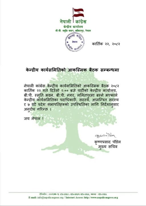 काठमाडौं। नेपाली कांग्रेसले केन्द्रीय कार्यसमितिको आकस्मिक बैठक बोलाइएको छ ।