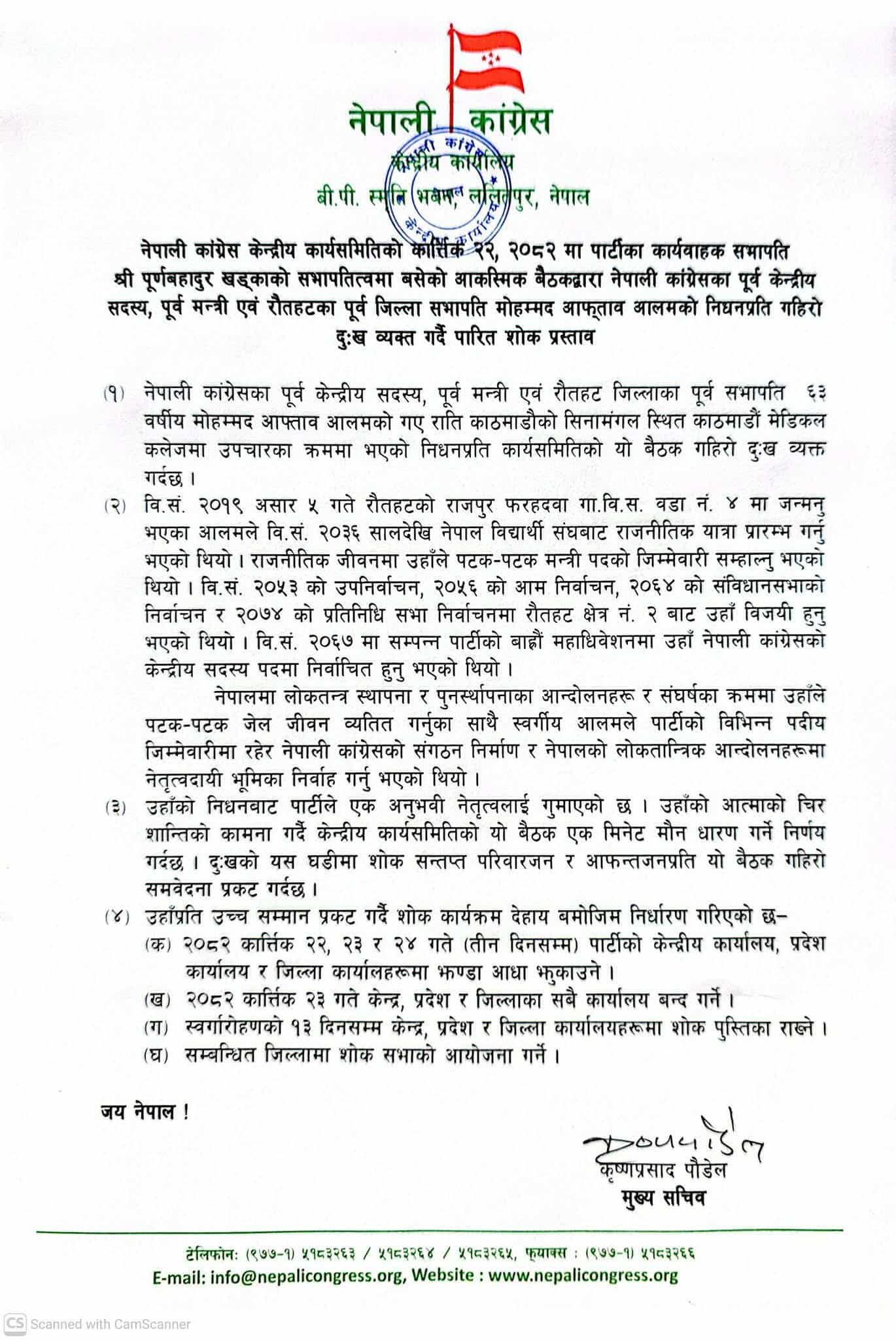 काठमाडौँ । नेपाली कांग्रेसले पार्टीका केन्द्रीय सदस्य अफताब आलमको निधनमा तीन दिनसम्म झण्डा आधा झुकाउने निर्णय गरेको छ । शनिबार बसेको सो पार्टीको आकस्मिक बैठकले शोक प्रस्ताव पारित गर्दै उक्त निर्णय गरेको हो ।