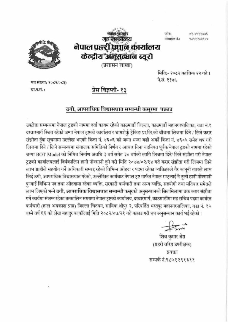 पक्राउ परेका कार्की तत्कालीन समयमा नेपाल ट्रष्टको कार्यालयमा सहसचिवका रूपमा कार्यरत थिए । हाल अवकाश प्राप्त सहसचिव कार्कीको बयानका आधारमा थप अनुसन्धान अघि बढ्ने प्रहरीको भनाइ छ ।