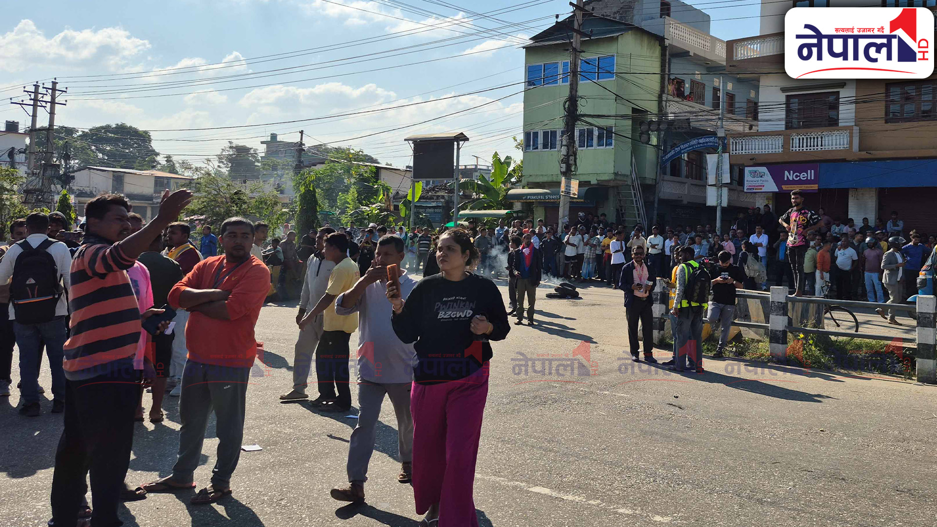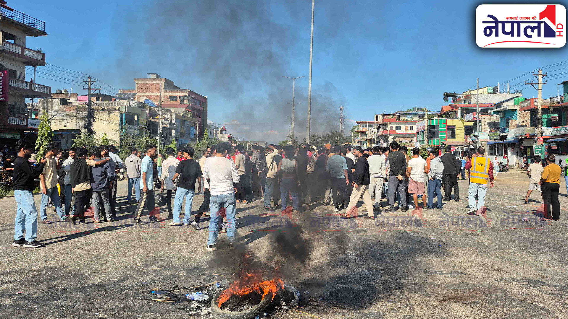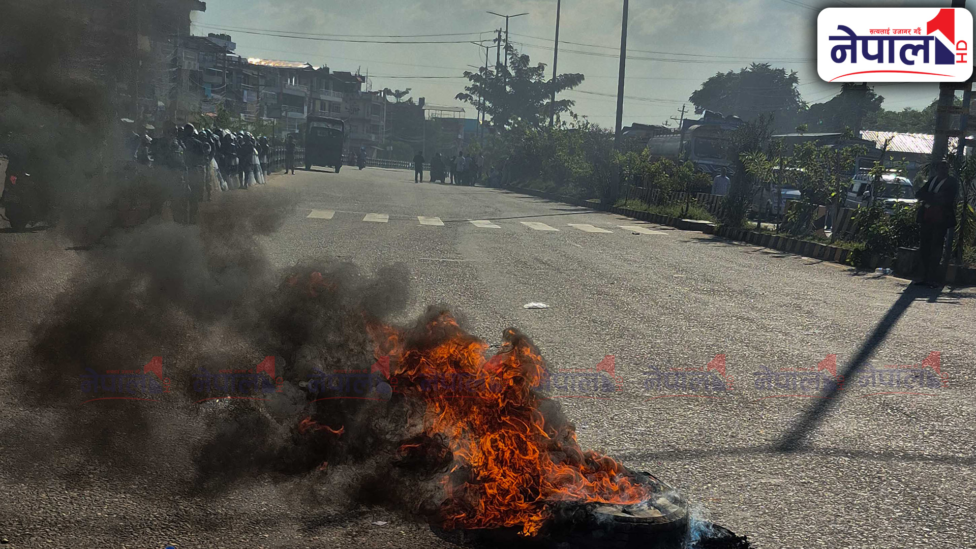 प्रदर्शनमा उत्रिएका जेन-जी समूहले सडकमा टायर बालेका छन् । प्रदर्शनकारी र एमाले कार्यकर्ताबीच झडप हुँदा यस क्षेत्रको अवस्था तनावग्रस्त बनेको छ ।