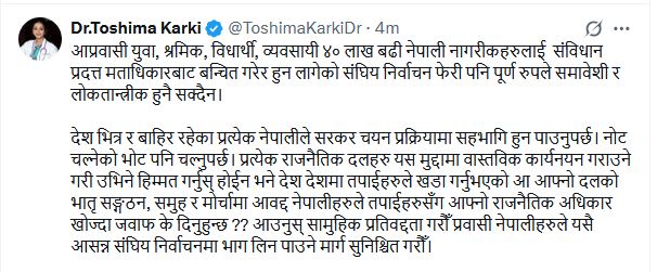 उनका अनुसार आयोजित हुन लागेका संघीय निर्वाचनहरूमा पनि ४० लाखभन्दा बढी विदेशस्थित नेपाली युवा, श्रमिक, विद्यार्थी तथा व्यवसायीहरू पुनः मताधिकारबाट वञ्चित हुन लागिरहेका छन्, जुन संविधानले सुनिश्चित गरेको मौलिक हकको उल्लंघन हो । कार्कीले भनेकी छन्, ‘देशभित्र वा देशबाहिर जहाँ बसेका भए पनि प्रत्येक नेपाली नागरिकलाई सरकार चयन प्रक्रियामा सहभागी हुन पाउने अधिकार छ । नोट चल्नेहरूको भोट पनि चल्नु पर्छ ।’