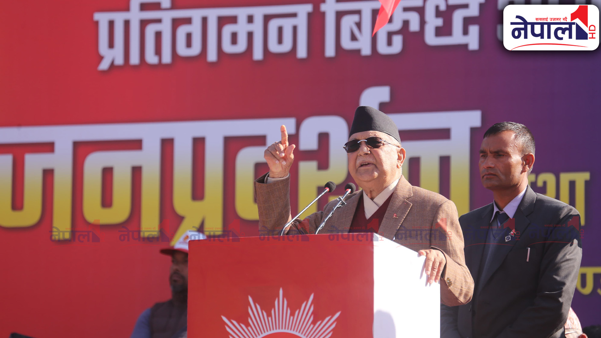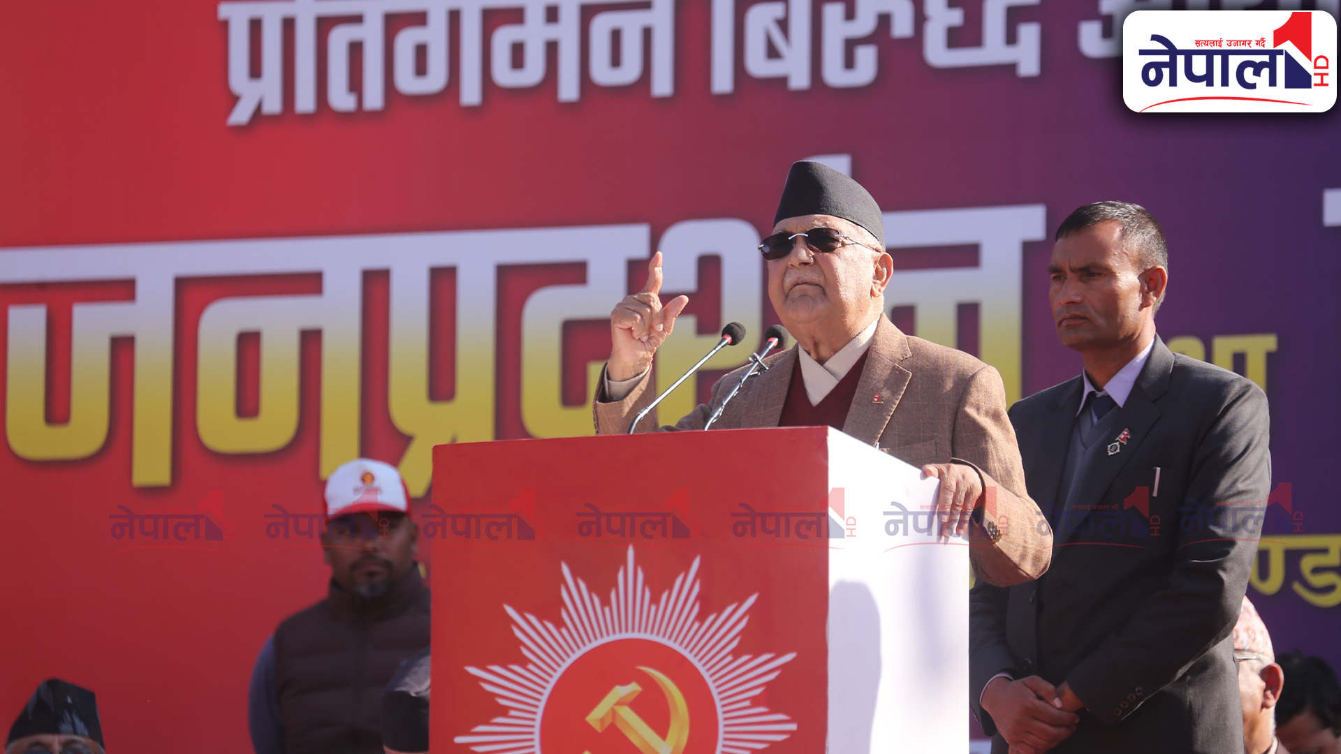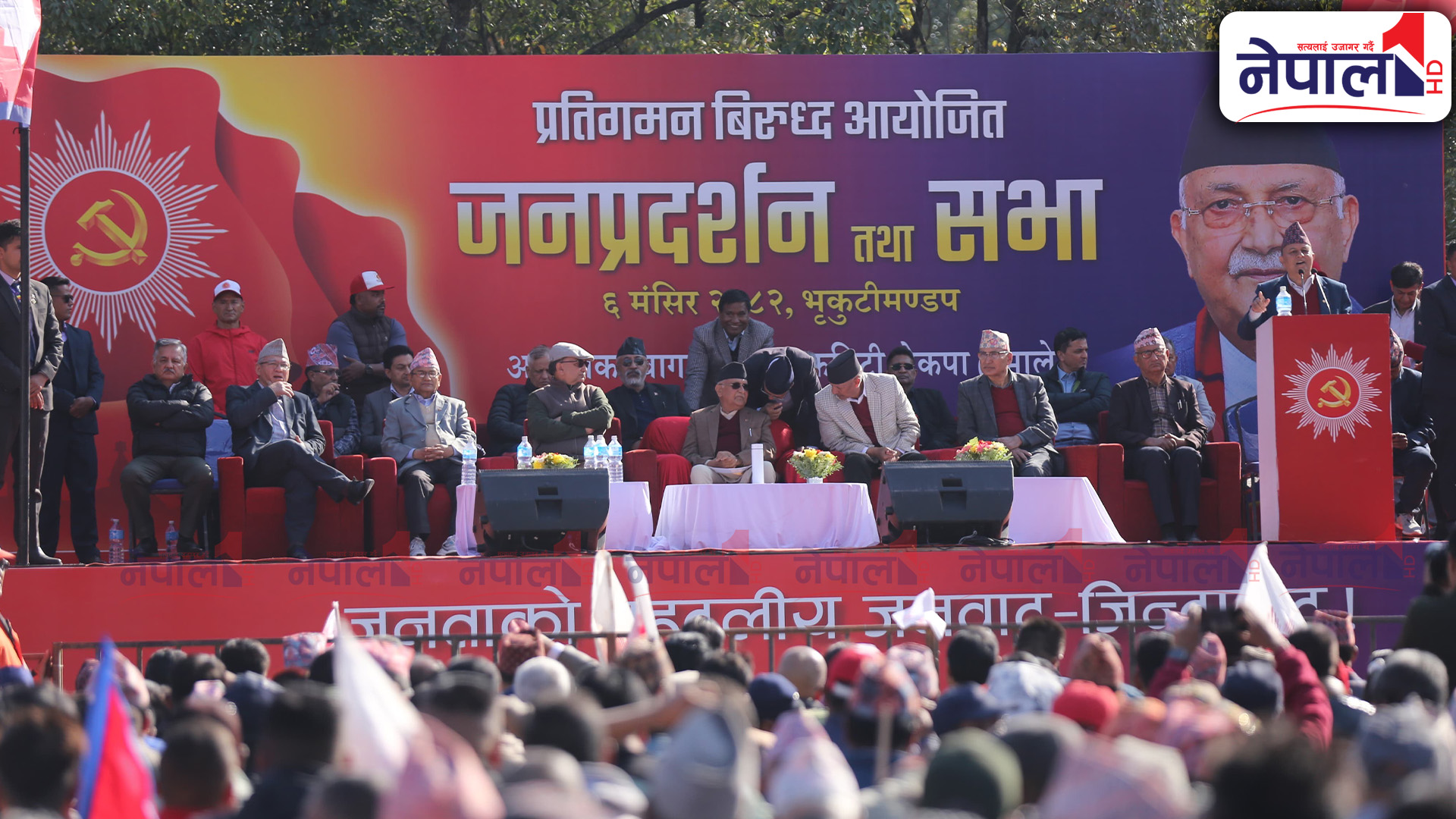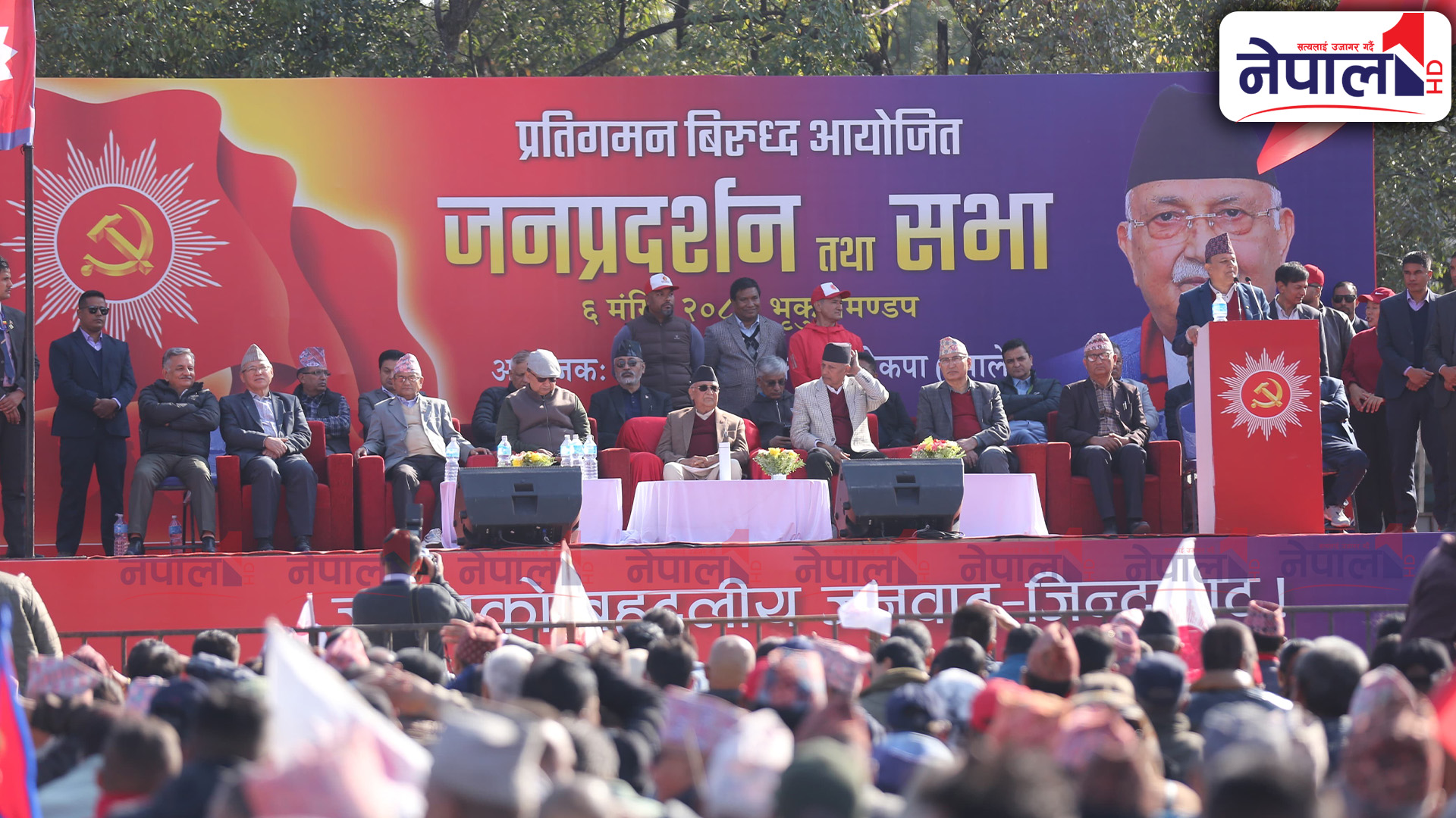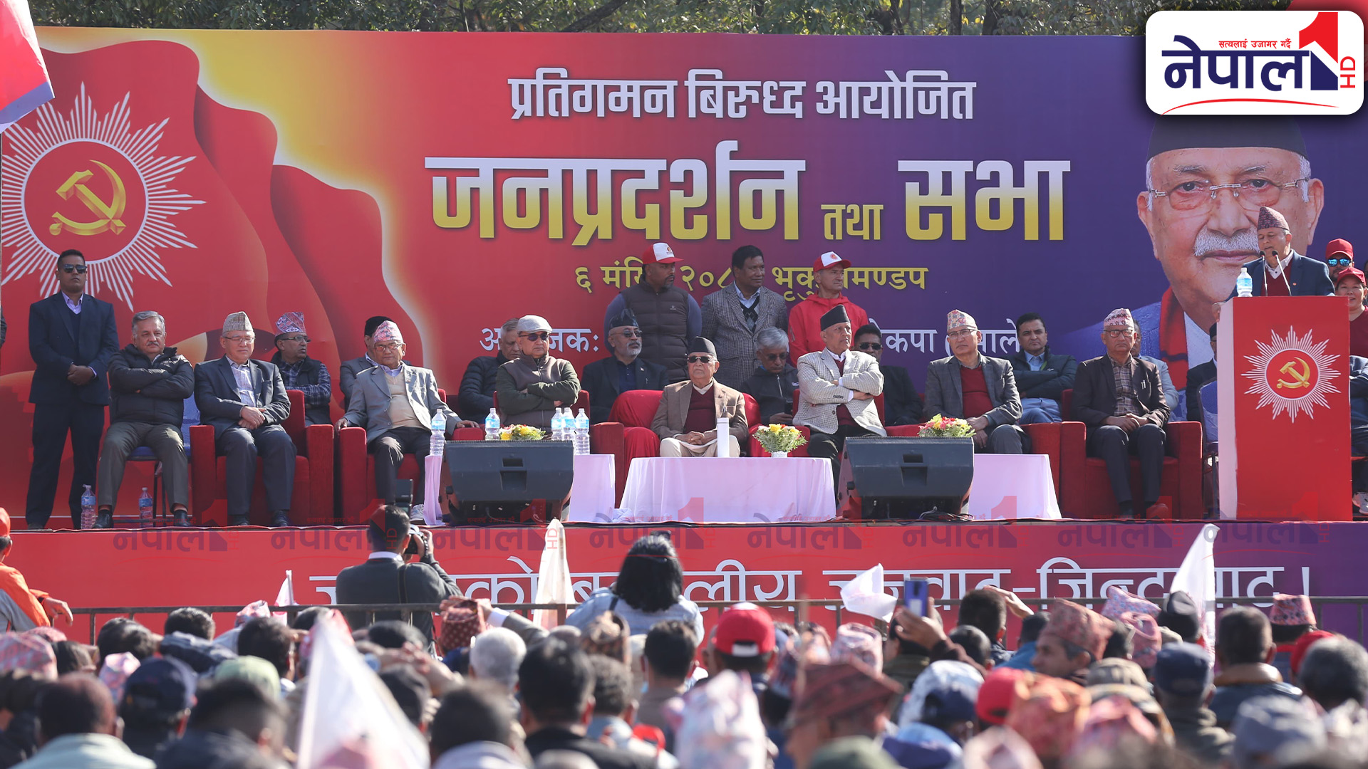 जस्मा अध्यक्ष ओलीले सम्बोधन गरिरहेका छन् । ओलीसहित अन्य नेताहरूपनि प्रतिनिधिसभाको पुनर्स्थापना र गणतन्त्रको रक्षाको लागि प्रतिगमन विरुद्ध जन प्रदर्शन र सभामा उपस्थित भएका छन् ।