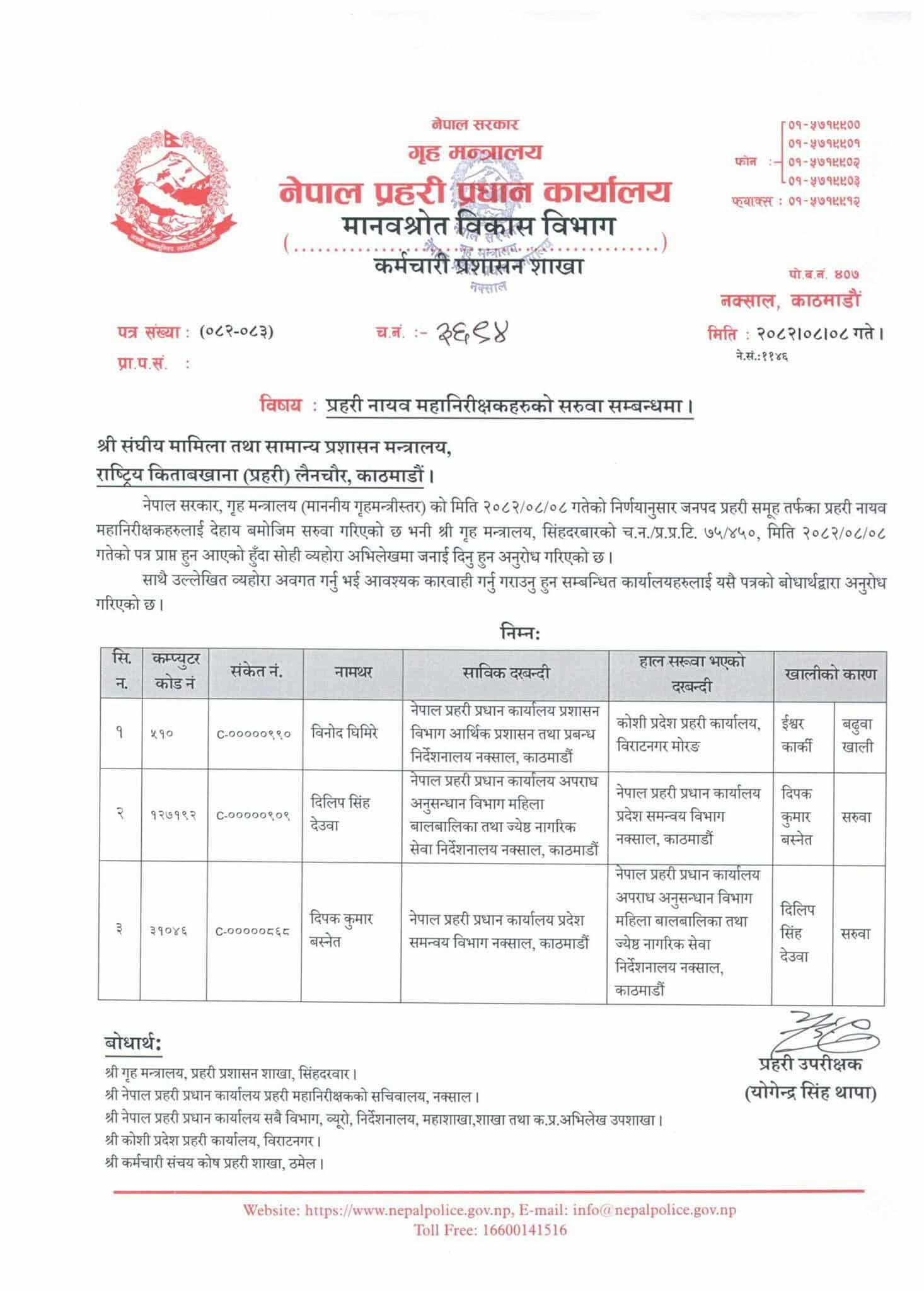 कोशी प्रदेशको जिम्मेवारी पाएका घिमिरे प्रहरी प्रधान कार्यालयको आर्थिक प्रशासन तथा प्रबन्ध निर्देशनालयमा केही हप्ता अघि मात्रै सरुवा भएका थिए । त्यसअघि उनी प्रहरीको केन्द्रीय प्रवक्ता थिए । प्रदेश समन्वय विभागमा दिलिप सिंह देउवा र महिला बालबालिका तथा ज्येष्ठ नागरिक सेवा निर्देशनालयमा दीपककुमार बस्नेतलाई सरुवा गरिएको छ ।