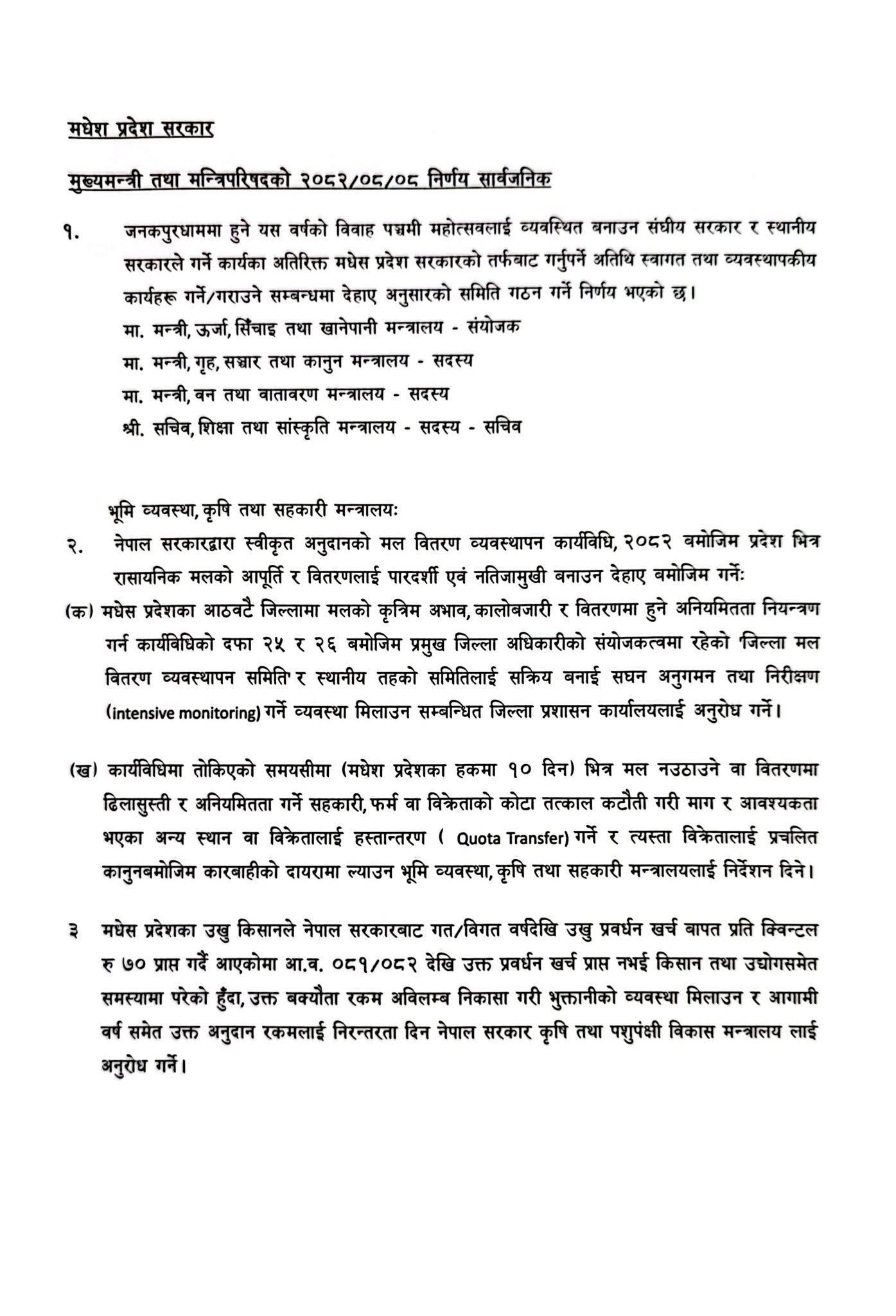 बैठकले मधेश प्रदेशका आठवटै जिल्लामा मलको कृत्रिम अभाव, कालोबजारी र वितरणमा हुने अनियमितता नियन्त्रण गर्न कार्यविधिको दफा २५ र २६ बमोजिम प्रमुख जिल्ला अधिकारीको संयोजकत्वमा रहेको ‘जिल्ला मल वितरण व्यवस्थापन समिति’ र स्थानीय तहको समितिलाई सक्रिय बनाई सघन अनुगमन तथा निरीक्षण गर्ने व्यवस्था मिलाउन सम्बन्धित जिल्ला प्रशासन कार्यालयलाई अनुरोध समेत गरेको छ ।