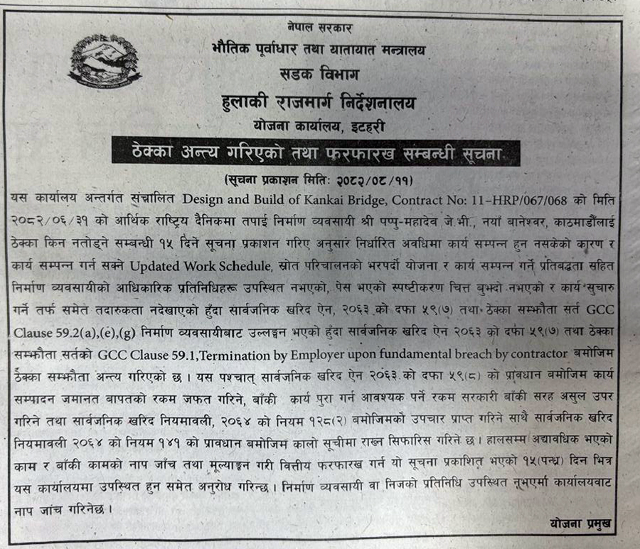 ऐनको प्रावधान बमोजिम कार्य सम्पादन जमानत वापतको रकम जफत गरिने, बाँकी काम पूरा गर्न आवश्यक पर्ने रकम सरकारी बाँकी सरह असूल उपर गरिने र कालोसूचीमा राख्न सिफारिस गरिएको जनाइएको छ । हालसम्मको अद्यावधिक भएको काम र बाँकी कामको नापजाँच मूल्याकन गरी वित्तीय फरफारख गर्न १५ दिनभित्र कार्यालयमा उपस्थित हुन अनुरोध गरिएको छ । निर्माण व्ष्वयासी कार्यालयमा उपस्थित नभएमा कार्यालयबाट नापचाँच गरिनेछ ।