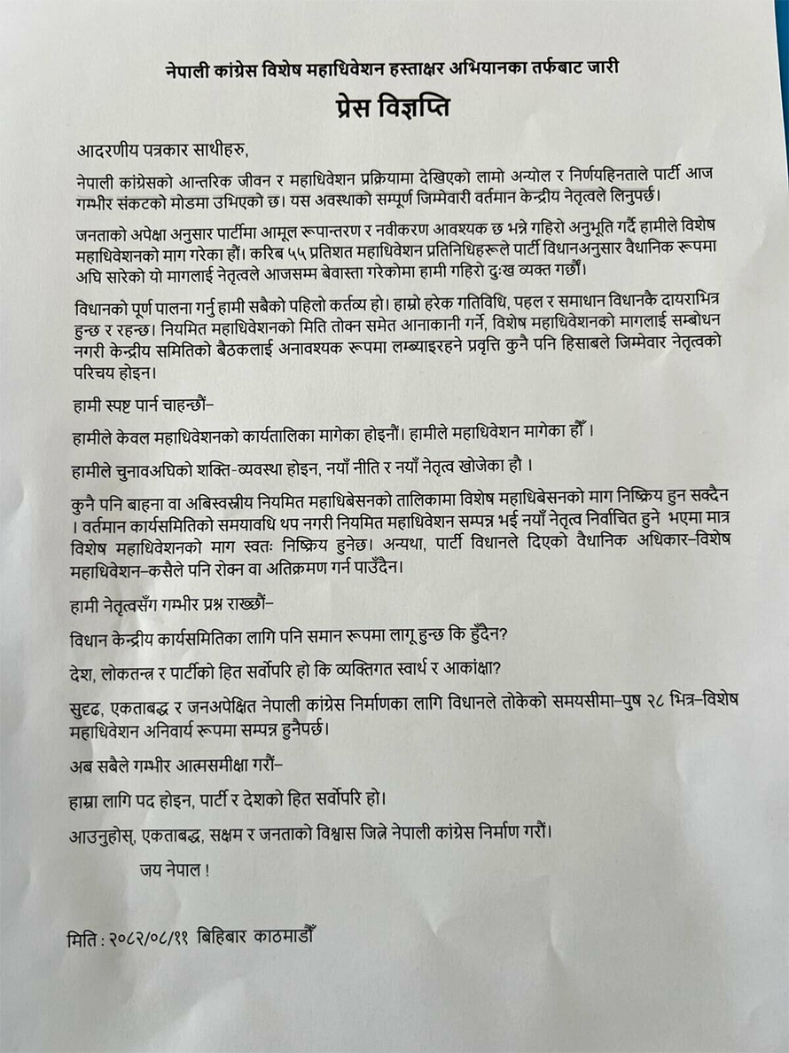 विशेष महाधिवेशन पक्षधरले वर्तमान नेतृत्वलाई यस विषयमा गम्भीर हुन आग्रह गर्दै, ‘दुई दिनमा गर्न सकिने निर्णय डेढ महिनासम्म गर्न नसक्ने नेतृत्व सक्षम नेतृत्व होइन। यही कारणले विशेष महाधिवेशनको महसुस भइरहेको छ । हस्ताक्षरकर्ताको विषयमा छलफल गरी विशेष महाधिवेशन बोलाउनु पर्छ’, भनि वक्तव्यमा उल्लेख गरेका छन् ।