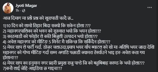 यस्तै, उनले महानगरपालिकाको भवनको सुरुआत भयो कि भएन, काठमाडौंको फोहोरले कति बिजुली उत्पादन भयो, अचेल महानगरको मिटिङ पाँच मिनेटमै सकिन्छ कि सकिँदैन, मेयर बालेनले पार्टी गर्दा, डोजर चलाउँदा झ्याप भएर ¥याप ब्याटलको शो मा अतिथि भएर जाँदादेखि महानगरको गोप्य मिटिङ गर्दासम्म अगाडि पछाडि क्यामरा तेस्र्याउने भाइहरू अचेल कता गए, मेयरका ‘हनुमान’ नगर प्रहरी प्रमुख राजु पाण्डेजीको बहुविवाह काण्ड के भयो भन्दै प्रश्न गरिन् ।