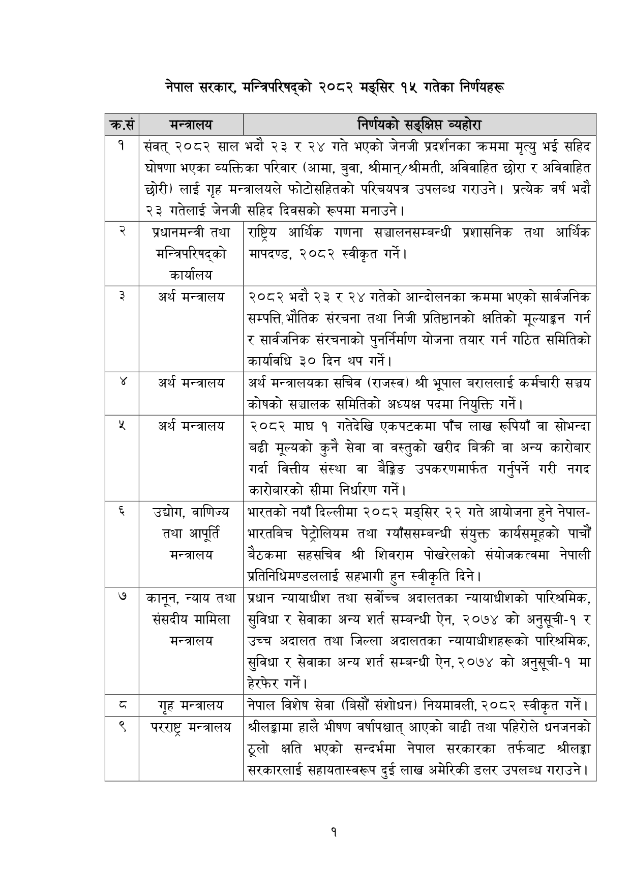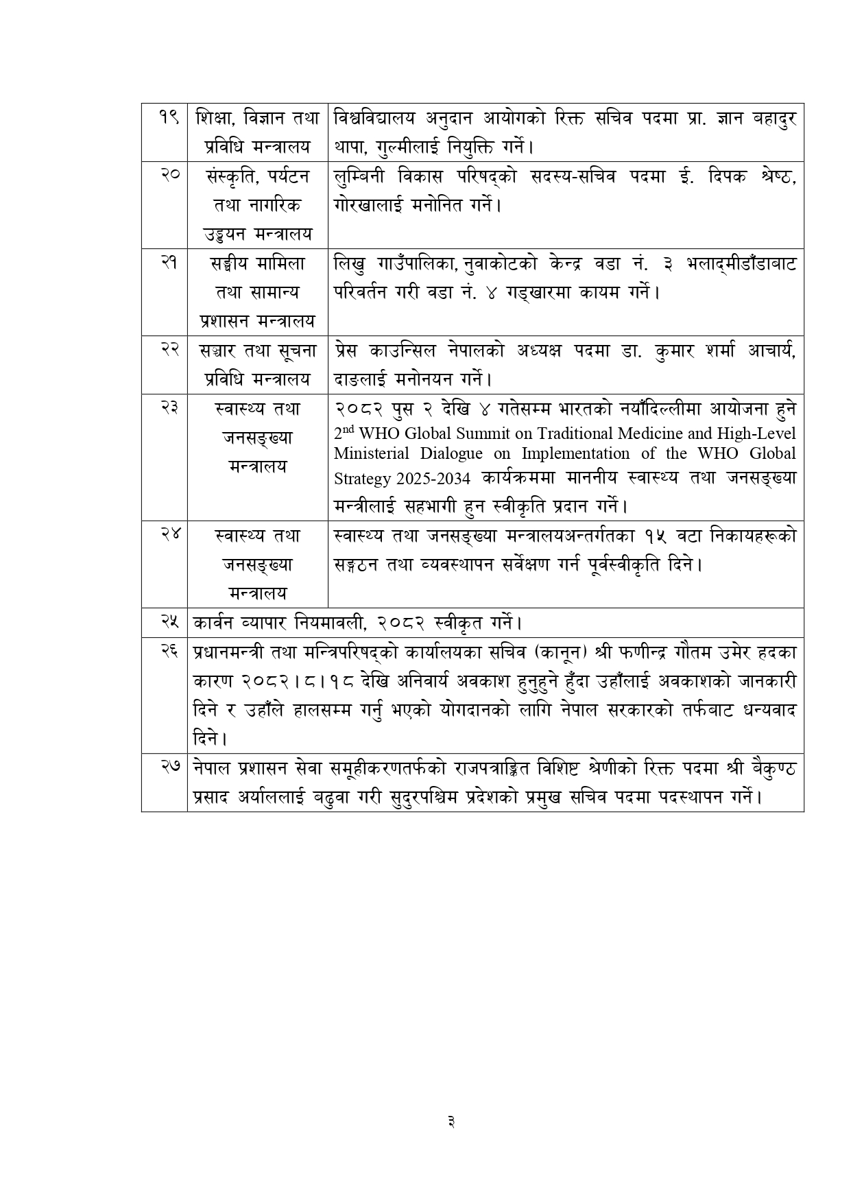 उनकाअनुसार सरकारले २०८२ भदौ २३ र २४ गतेको आन्दोलनका क्रममा भएको सार्वजनिकः सम्पती, भौतिक संरचना तथा निजी प्रतिष्ठानको क्षतिको मूल्याङ्कन गर्न र सार्वजनिक संरचनाको पुनर्निर्माण योजना तयार गर्न गठित समितिको कार्यावधि ३० दिन थप गर्ने निर्णय भएको छ । त्यस्तै भूपाल बराललाई कर्मचारी सञ्चय कोषको सञ्चालक समितिको अध्यक्ष पदमा नियुक्ति गरेको छ । नेपाली सेनाका तीन जना सहायक रथीको पदावधि थप गर्ने र एक जना महासेनानीको राजीनामा स्वीकृत गर्ने निर्णय गरेको छ ।