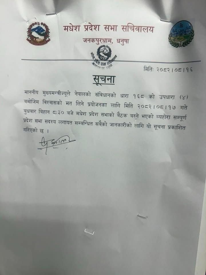 यद्यपि मंगलबार बेलुकै सर्वदलीय बैठकमा पुनः छलफल हुँदा आज बिहान साढे ८ बजेमै बैठक बसाल्ने सहमति बनेको उपसभामुखको सचिवालयले जनाएको छ । दलगत सहमतिअनुसार नै पुनः आह्वान गरिएको बैठकमा मुख्यमन्त्री यादवले आफ्नो सरकार कायम राख्ने कि ढल्ने भन्ने निर्णायक क्षण आउनेछ । प्रदेश राजनीतिक तरलताका बीच बसेको यस बैठकले मधेसको सत्ता समीकरणमा महत्वपूर्ण मोड ल्याउने अपेक्षा गरिएको छ ।