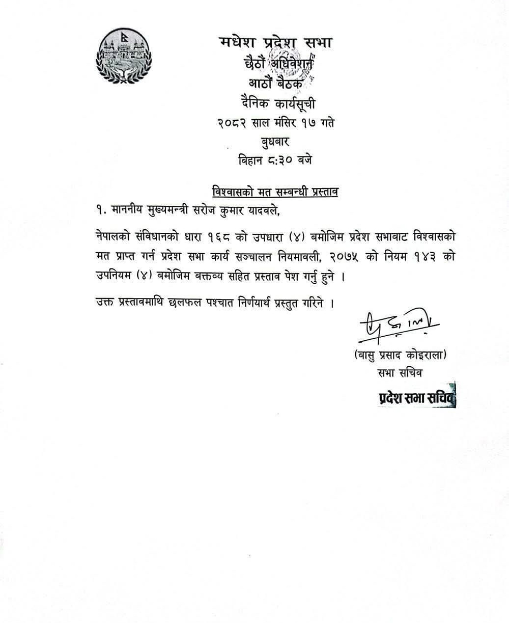 यसअघि सात दलको समर्थनमा मुख्यमन्त्री बनेका लोसपा नेता जितेन्द्र सोनलले विश्वासको मत नपाउने अवस्था बनेपछि राजीनामा दिएका थिए । त्यसपछि संविधानको धारा १६८(३) अनुसार प्रदेश प्रमुख सुमित्रा सुवेदी भण्डारीले एमाले संसदीय दलका नेता सरोजकुमार यादवलाई नयाँ मुख्यमन्त्री नियुक्त गरेकी थिइन् । तर बर्दिवासस्थित होटलमा झिसमिसेमा गरिएको शपथले व्यापक विवाद खडा गर्दै दलहरू सर्वोच्च अदालतसम्म पुगेका थिए । अब सबैको ध्यान मुख्यमन्त्री यादव कहिले सभामा पुग्छन् र विश्वासको मतको प्रक्रिया अघि बढ्छ कि बढ्दैन भन्ने प्रश्नमा केन्द्रित छ । बैठक बस्न ढिलाइ भइरहेका बेला प्रदेश सभाभित्र र वरिपरि राजनीतिक तनाव, प्रतीक्षा र अनिश्चितताको माहोल छ ।