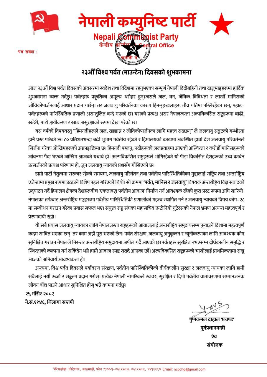काठमाडौँ, २५ मङ्सिरः नेपाली कम्युनिष्ट पार्टीका संयोजक पुष्पकमल दाहाल ‘प्रचण्ड’ले २३औँ विश्व पर्वत दिवसका अवसरमा आज शुभकामना सन्देश जारी गरेर पर्वतहरू प्रकृतिका अमूल्य धरोहर भएकाले तिनको संरक्षण आवश्यक भएकामा जोड दिनुभएको छ ।