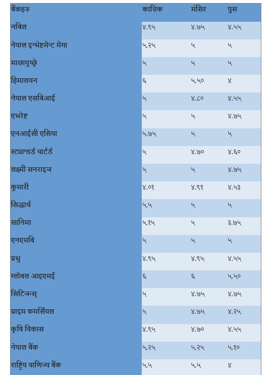 बैंकहरूले पुसका लागि घटाए ब्याजदर घटाए, कसको कति ?