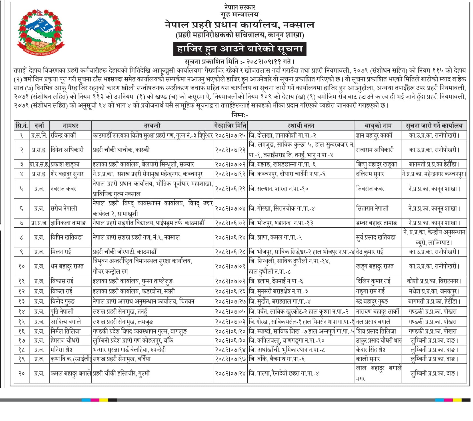 गैरहाजिर २० प्रहरीलाई सात दिनभित्र हाजिर हुन निर्देशन