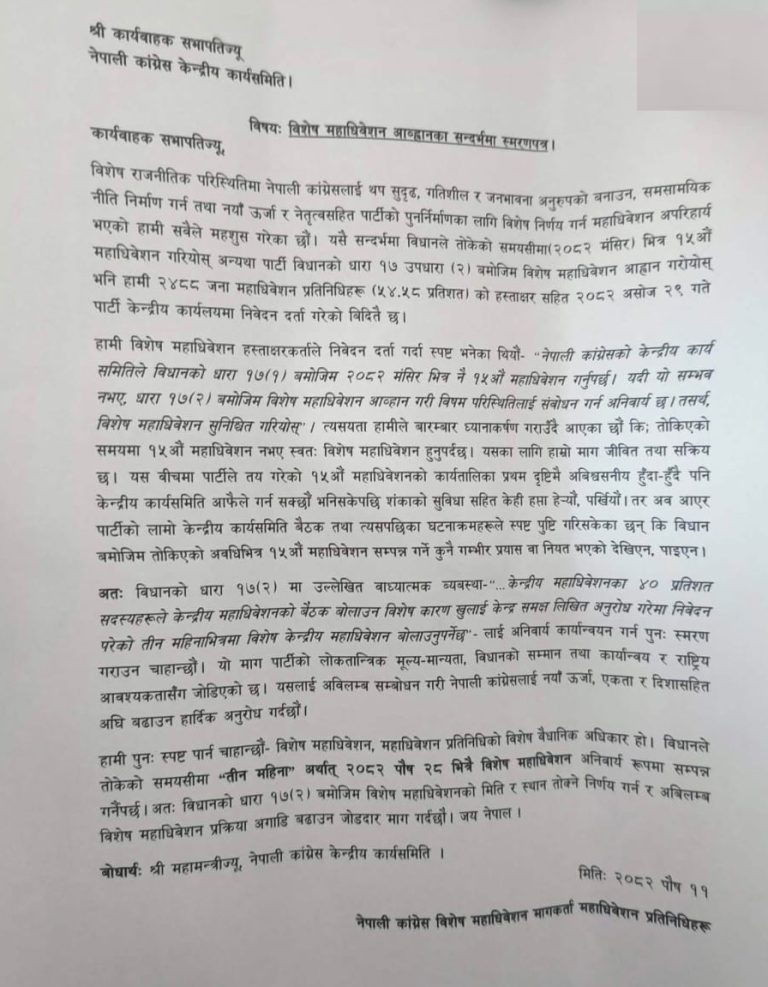 कार्यवाहक सभापतिलाई बुझाइएको स्मरण पत्रमा उनीहरूले विधानले तोकेको समयसीमा २०८२ मंसिरभित्र १५औँ महाधिवेशन सम्पन्न गर्न माग गरिएको उल्लेख गरेका छन् । अन्यथा पार्टी विधानको धारा १७ उपधारा (२) बमोजिम स्वतः विशेष महाधिवेशन आह्वान गर्नुपर्ने उनीहरूको माग छ ।पत्रमा उल्लेख भएअनुसार, २४८८ जना महाधिवेशन प्रतिनिधि (५४.५८ प्रतिशत) ले २०८२ असोज २९ गते विशेष महाधिवेशनको मागसहित पार्टी केन्द्रीय कार्यालयमा औपचारिक निवेदन दर्ता गरिसकेका छन् । पक्षधरहरूले प्रारम्भमा केन्द्रीय कार्यसमितिलाई ‘शङ्काको सुविधा’ दिँदै केही समय पर्खिए पनि पछिल्ला केन्द्रीय समिति बैठक र त्यसपछिका गतिविधिले समयमै महाधिवेशन गर्ने इच्छाशक्ति नदेखाएको निष्कर्षमा पुगेको बताएका छन् । विशेष महाधिवेशन पक्षधरहरूको यो दबाब, महामन्त्रीद्वयको सार्वजनिक समर्थन र विधानको स्पष्ट व्यवस्थाले नेपाली कांग्रेसभित्र आगामी दिनमा विशेष महाधिवेशनको राजनीतिक बहस झनै तीव्र हुने संकेत देखिएको छ ।