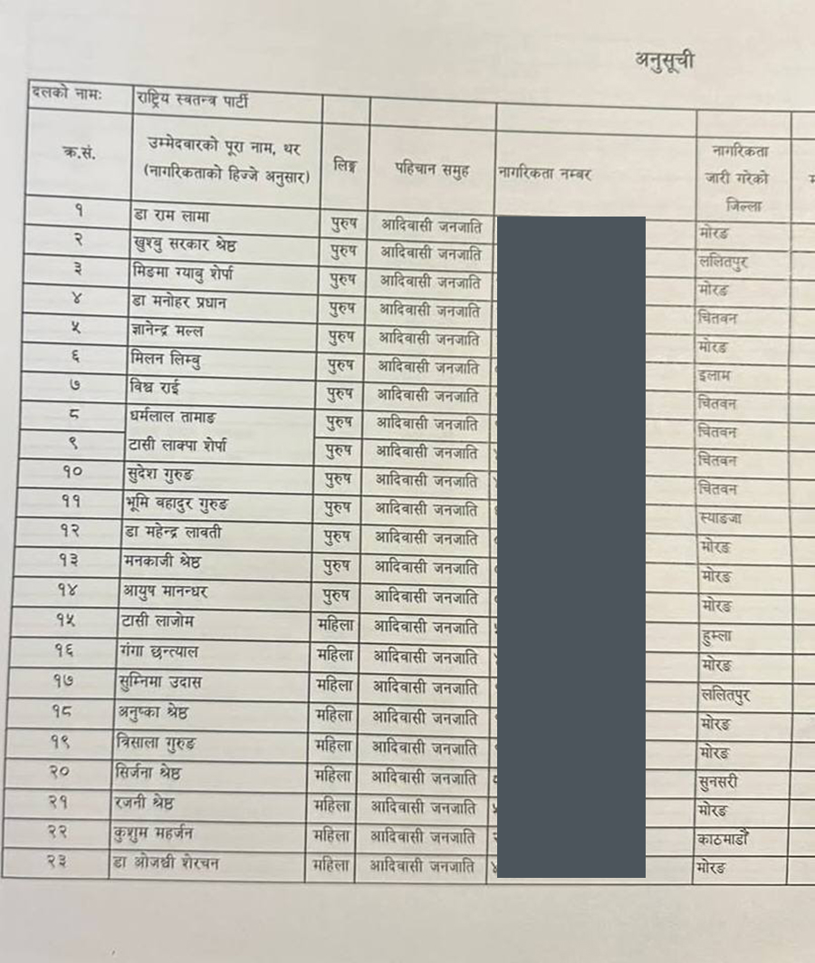 काठमाडौं । राष्ट्रिय स्वतन्त्र पार्टी (रास्वपा) ले आगामी निर्वाचनका लागि ११० जनाको समानुपातिक उम्मेदवारको बन्दसूची निर्वाचन आयोगमा दर्ता गराएको छ । सोमबार राति बुझाइएको सूचीमा कला, खेल, राजनीति र विभिन्न सामाजिक समुदायका चर्चित तथा प्रतिनिधिमूलक व्यक्तिहरूलाई समेटिएको छ ।