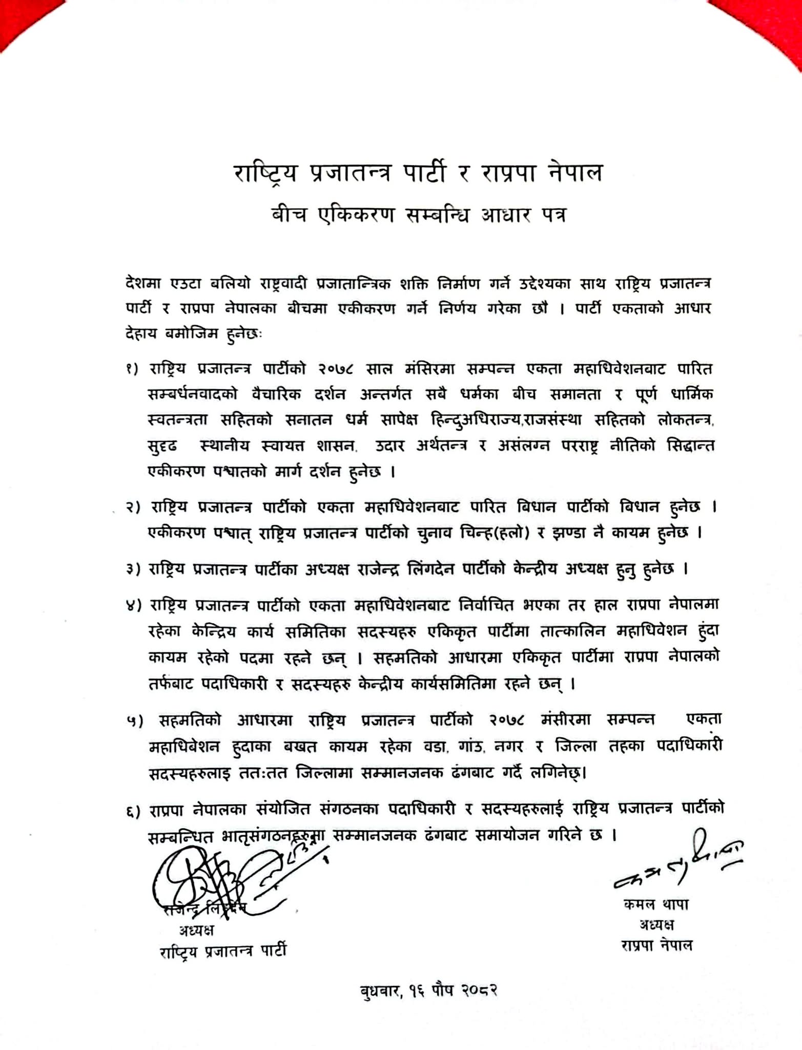 ४) राष्ट्रिय प्रजातन्त्र पार्टीको एकता महाधिवेशनबाट निर्वाचित भएका तर हाल राप्रपा नेपालमा रहेका केन्द्रीय कार्य समितिका सदस्यहरू एकीकृत पार्टीमा तत्कालीन महाधिवेशन हुँदा कायम रहेको पदमा रहने छन् । सहमतिको आधारमा एकीकृत पार्टीमा राप्रपा नेपालको तर्फबाट पदाधिकारी र सदस्यहरू केन्द्रीय कार्यसमितिमा रहने छन् ।