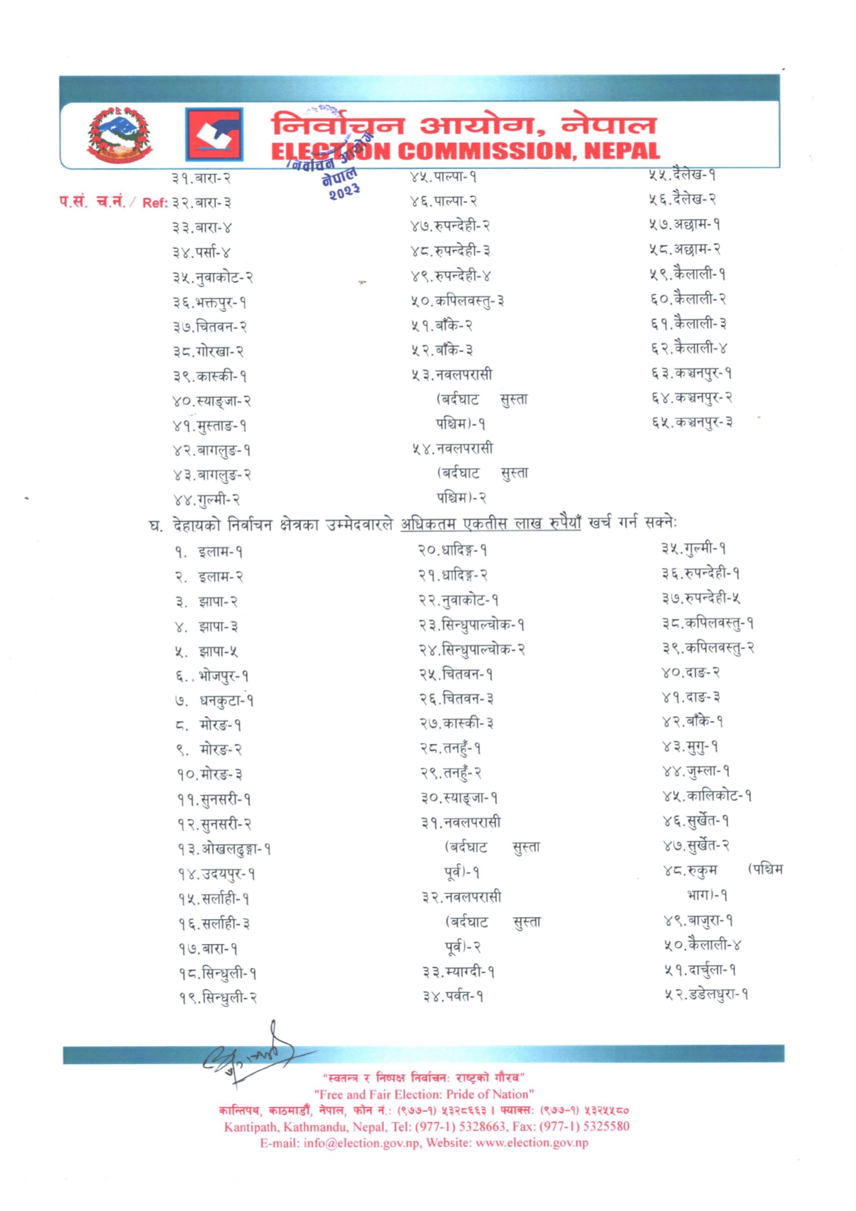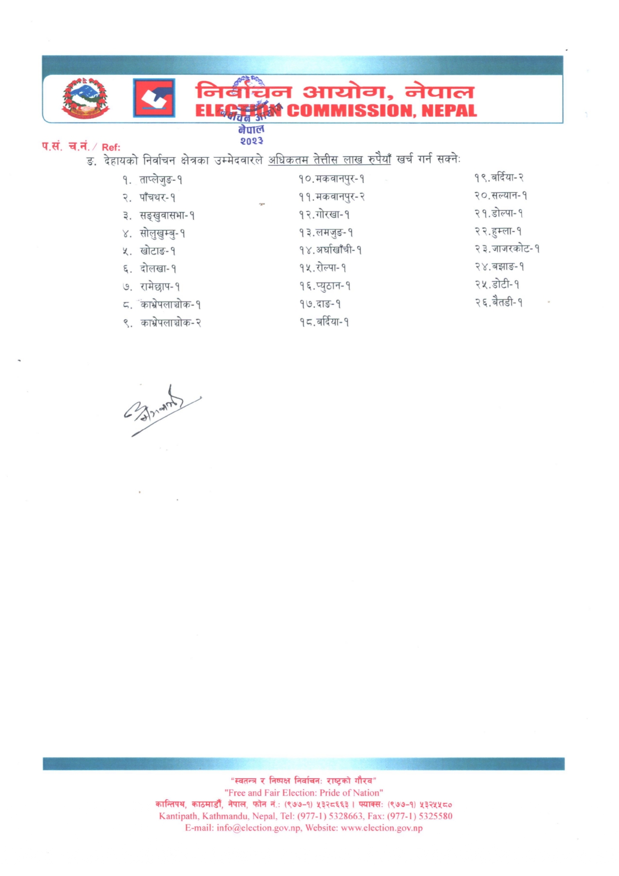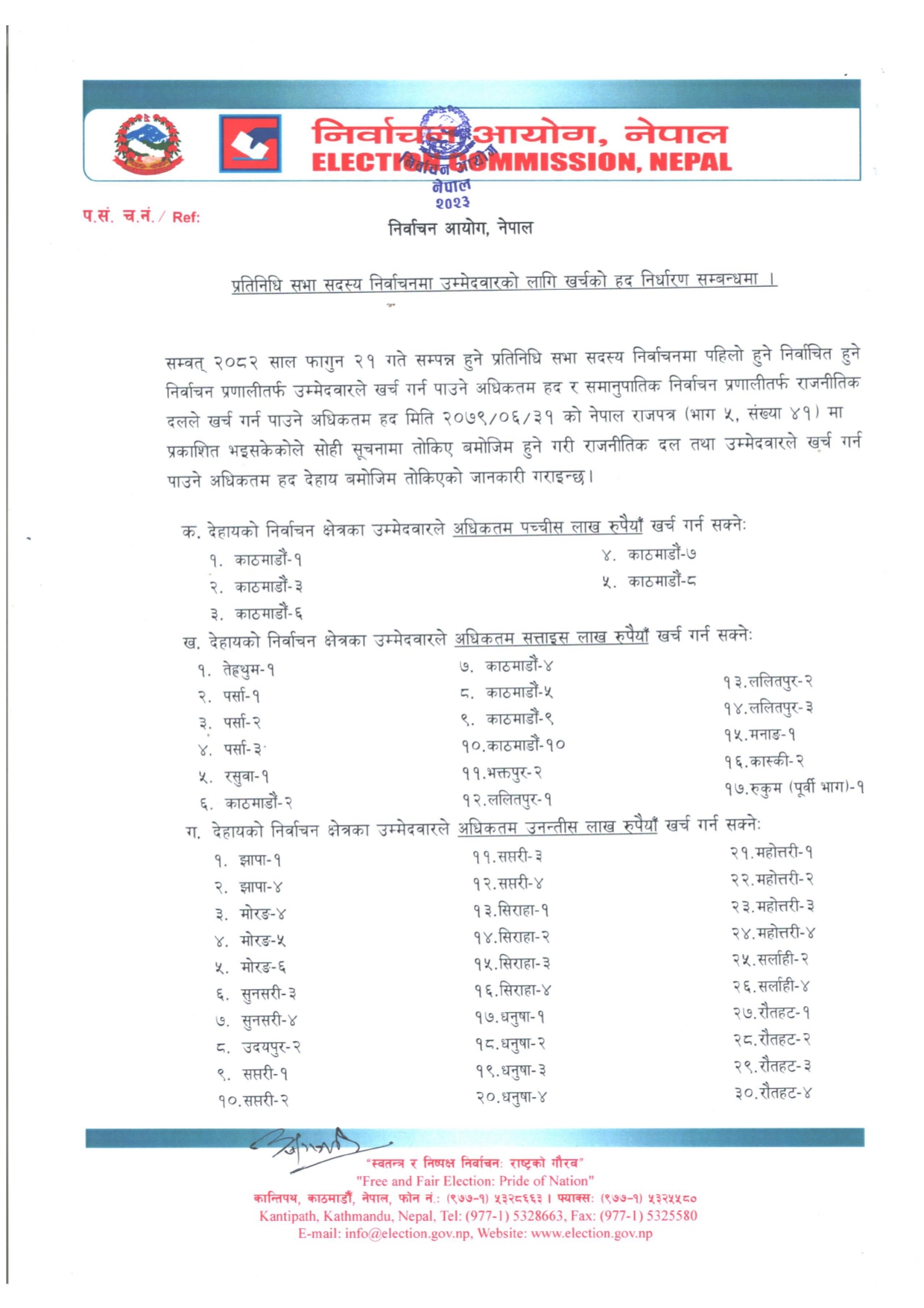 क्रमश: ‘ख’ मा रहेका निर्वाचन क्षेत्रका उम्मेदवारले सत्ताईस लाख, ‘ग’ मा भएका निर्वाचन क्षेत्रका उम्मेदवारले उनान्तीस लाख, ‘घ’ मा समावेश निर्वाचन क्षेत्रका उम्मेदवारले एकतिस लाख र ‘ङ’ मा हुने निर्वाचन क्षेत्रका उम्मेदवारले अधिकतम् तेत्तीस लाखसम्म खर्च गर्न पाउने छन् ।