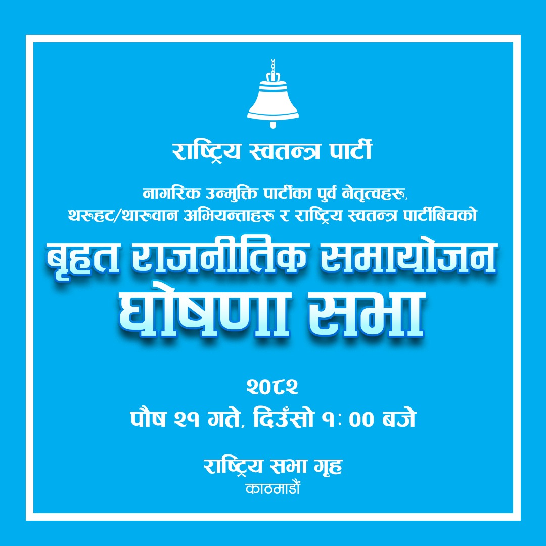 काठमाडौं । राष्ट्रिय स्वतन्त्र पार्टी (रास्वपा) ले भोलि (सोमबार) बृहत्तर एकता घोषणा सभा गर्ने भएको छ । रास्वपाले आइतबार जारी गरेको विज्ञप्तिअनुसार भोलि दिउँसो १ बजे राष्ट्रियसभा गृहमा एकताको औपचारिक घोषणा कार्यक्रम आयोजना गर्ने भएको हो।