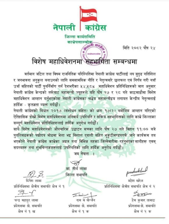 काभ्रेको क्षेत्र नं १ का सभापति दिनेश लामा र क्षेत्र नं २ का सभापति महेश खरेलसहित प्रदेश सभा क्षेत्रका सभापतिहरूले समेत विशेष महाधिवेशनप्रति ऐक्यबद्धता जनाएका छन् । यसले विशेष महाधिवेशनको पक्षमा जिल्लास्तरबाट समेत संस्थागत समर्थन बढ्दै गएको देखाउँछ । महाधिवेशनको मिति नजिकिँदै जाँदा भृकुटीमण्डप परिसरमा नेता–कार्यकर्ताको आवतजावत बढ्न थालेको छ भने कांग्रेसभित्रको राजनीतिक तापक्रम थप चर्किदै गएको छ । विशेष महाधिवेशनले पार्टीको आगामी दिशा र आन्तरिक शक्ति सन्तुलनमा के असर पार्ला भन्ने चासो अहिले कांग्रेस वृत्तमा केन्द्रित बनेको छ ।