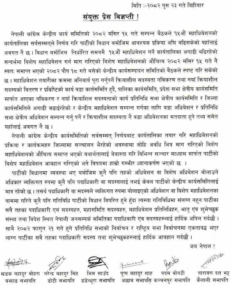 विज्ञप्तिमा पार्टी विधानको व्यवस्था उद्धृत गर्दै केन्द्रीय कार्यसमितिको औपचारिक निर्णय विना कुनै पनि पदाधिकारी वा व्यक्तिले अधिवेशन वा विशेष अधिवेशन आह्वान गर्न नपाउने उल्लेख गरिएको छ । ‘पदाधिकारी वा सदस्यले व्यक्तिगत हैसियतमा बोलाएको अधिवेशनका नाममा गरिने सबै गतिविधि विधानविपरीत हुन्छ’, विज्ञप्तिमा भनिएको छ, ‘त्यसैले यस्ता अवैधानिक क्रियाकलापमा संलग्न नहुन पार्टीका सबै तहका पदाधिकारी, सदस्य, महासमिति सदस्य, महाधिवेशन प्रतिनिधि तथा भातृ एवं शुभेच्छुक संस्थाका प्रतिनिधिलाई हार्दिक अपिल गर्दछौं ।’