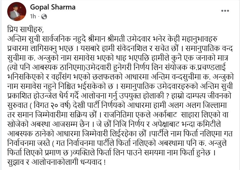 आलोचना बढेपछि नेकपाका प्रत्यक्ष उम्मेदवार गोपाल शर्माले पत्नीको नाम समानुपातिक बन्दसूचीबाट हटाउने घोषणा गरेका छन् । शनिबार बिहान फेसबुकमार्फत धारणा सार्वजनिक गर्दै शर्माले समानुपातिक सूचीमा अञ्जुको नाम परेको थाहा पाउना साथ कुनै एक जना मात्र उम्मेदवार हुने गरी पार्टी संयोजक पुष्पकमल दाहाल ‘प्रचण्ड’ सँग कुरा भइसकेको जानकारी दिएका छन् । उनले अन्तिम बन्दसूचीमा अञ्जुको नाम समावेश नहुने निश्चित भइसकेको दाबी गरेका छन् ।