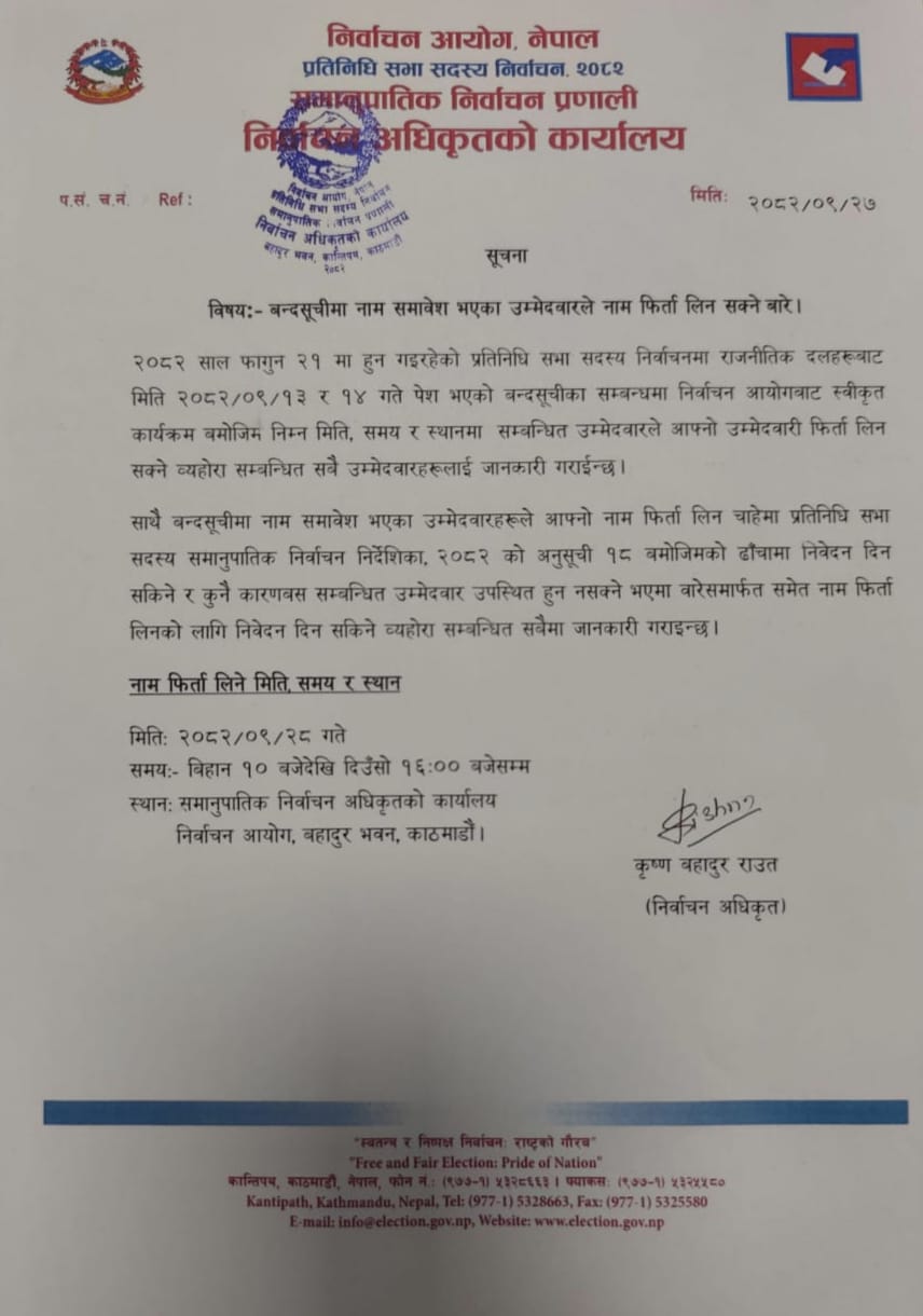 निर्वाचन आयोगले आइतबार विज्ञप्ति जारी गरी सोमबार बिहान १० बजेदेखि ४ बजेसम्म उम्मेद्वारी फिर्ताको निवेदन दिन सूचना जारी गरेको हो ।
