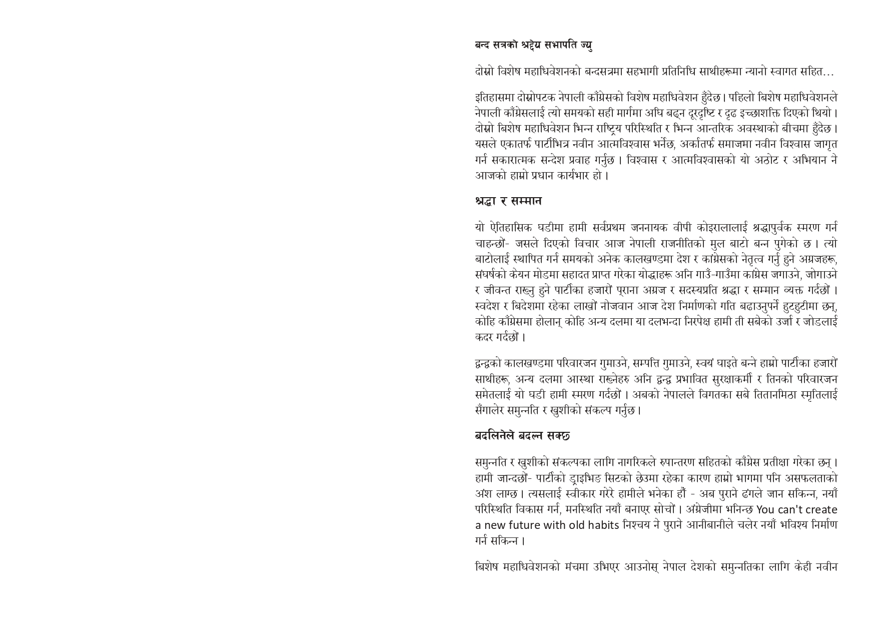 ०६२/६३ को जनआन्दोलन र मधेस आन्दोलनबाट प्राप्त उपलब्धिलाई सुरक्षित राख्दै पछिल्ला असन्तुष्टिको भावनालाई सम्बोधन गर्नुपर्नेमा कांग्रेस नेतृत्व सचेत देखिएको छ । विशेष महाधिवेशन कांग्रेसका लागि केवल संगठनात्मक अभ्यास होइन, नेतृत्व, नीति र राजनीतिक संस्कृतिमा ‘रीसेट’ गर्ने प्रयासको रूपमा उभिएको छ । देउवा नेतृत्वको भविष्य, नयाँ नेतृत्व चयन र पार्टीको चुनावी रणनीतिले कांग्रेसको आगामी राजनीतिक यात्रा कुन मोड लिन्छ भन्ने कुरा अब यही विशेष महाधिवेशनका निर्णयले निर्धारण गर्नेछ ।