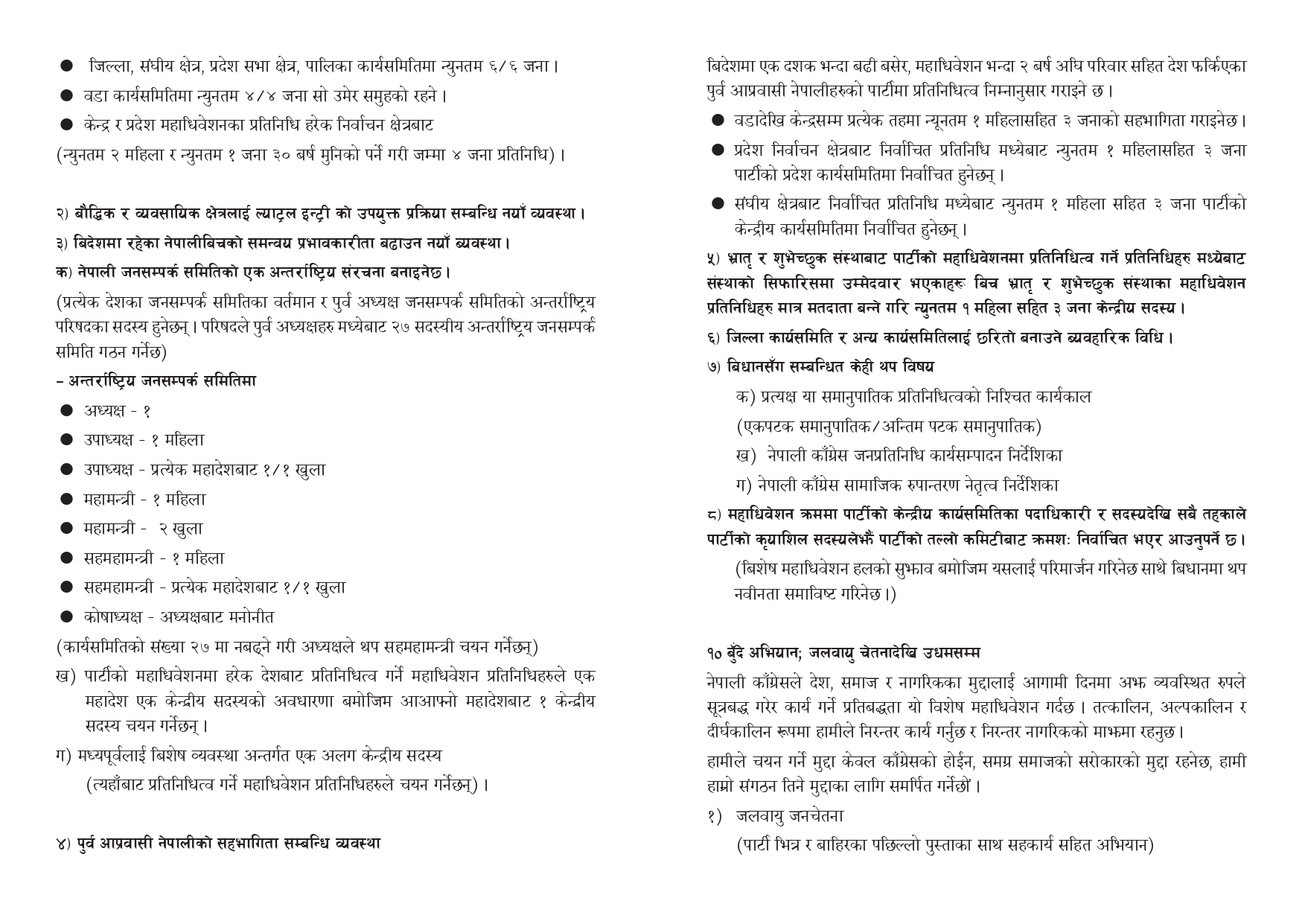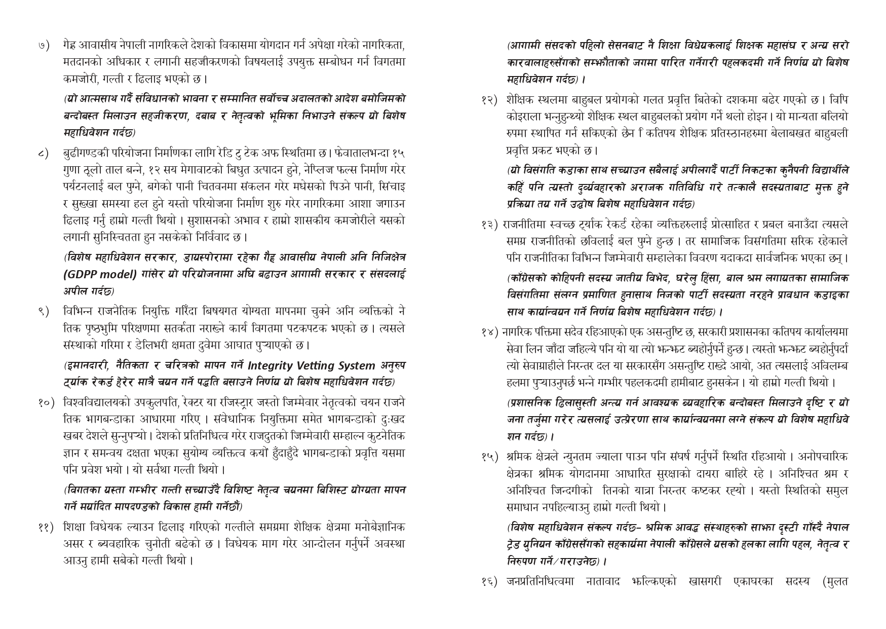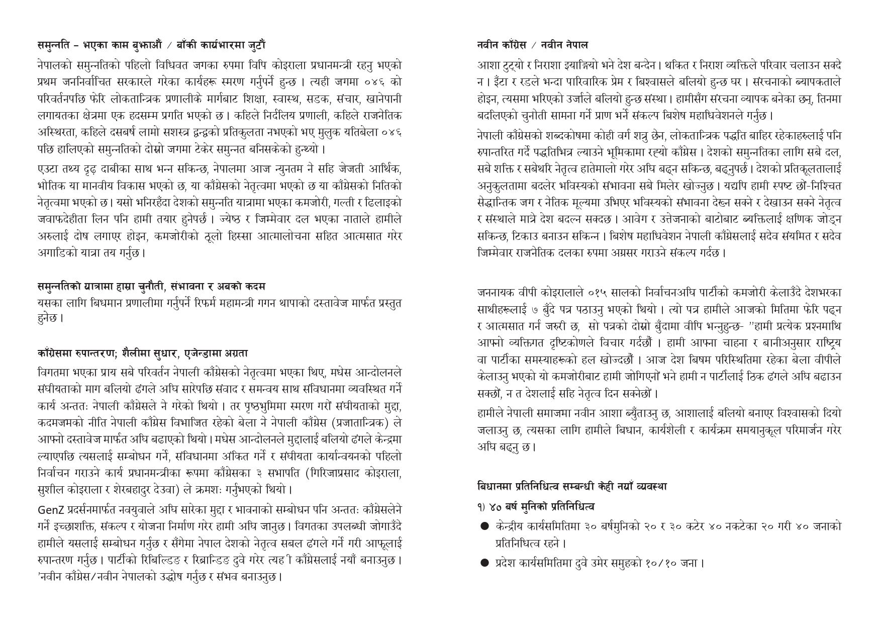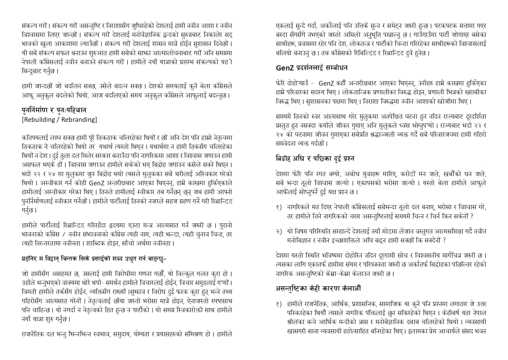 उनले यो नीतिलाई संविधानमै लिपिबद्ध गर्न कांग्रेसले अग्रसरता लिने उल्लेख गरेका छन् । साथै, विगतका गल्ती सच्याउँदै आगामी निर्वाचनमा कुनै पनि दलसँग चुनावी गठबन्धन नगरी कांग्रेस एक्लै प्रतिस्पर्धा गर्ने प्रस्ताव पनि पेश गरिएको छ । चुनावी गठबन्धनले मतदाताको स्वतन्त्र विवेक र पार्टी कार्यकर्ताको सम्मानमा असर पारेको निष्कर्ष प्रस्तावमा समेटिएको छ ।
