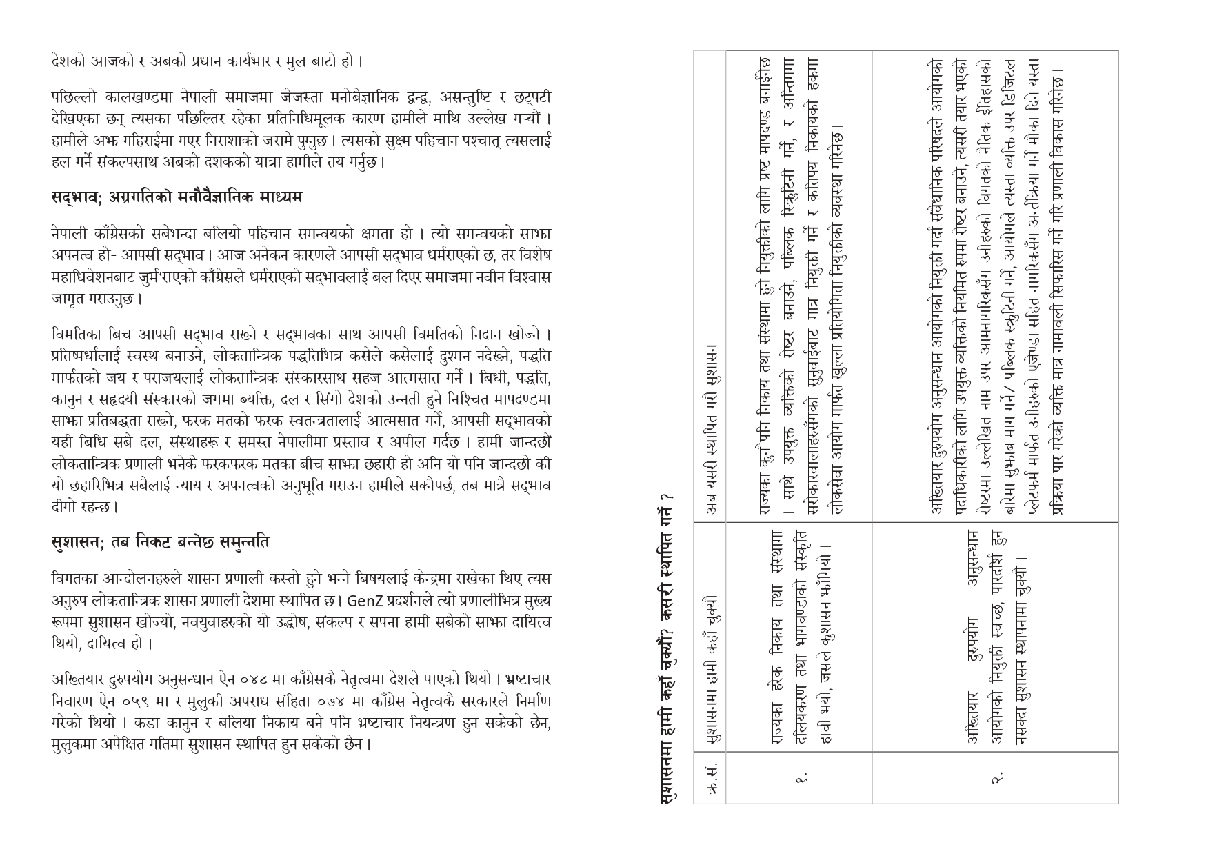 प्रतिवेदनमा कांग्रेसको ऐतिहासिक चरित्रलाई स्मरण गर्दै लोकतान्त्रिक मूल्य–मान्यतामा अटल रहँदै समयअनुसार एजेण्डामा लचकता अपनाउँदै आएको दाबी गरिएको छ । सुशासन, सद्भाव र समुन्नतिलाई आजको नेपालको प्रमुख तीन एजेण्डा ठहर गर्दै विशेष महाधिवेशनले यही आधारमा आगामी राजनीतिक कार्यदिशा तय गर्ने निष्कर्ष निकाल्ने संकेत दिएको छ ।
