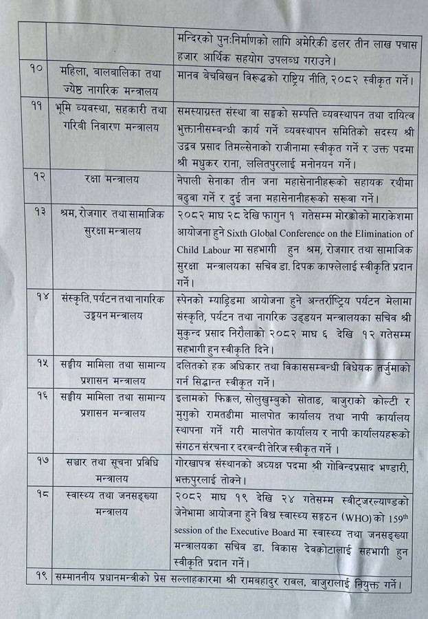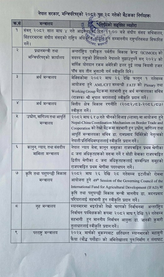 मन्त्रिपरिषद बैठकका १९ निर्णय सार्वजनिक : वित्तीय रणनीतिदेखि राष्ट्रिय सभा अधिवेशनसम्म