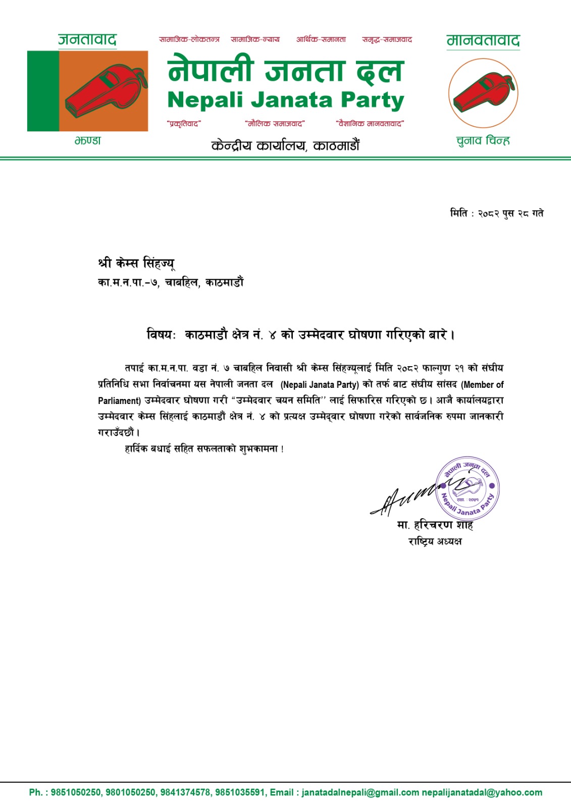 नेपाली जनता दलले काठमाडौं क्षेत्र नम्बर ४मा युवा नेता केम्स सिंहलाई उम्मेदवार बनाउने भएको छ । पार्टी अध्यक्ष हरिचरण साहले आज एक विज्ञप्ति जारी गरि फागुन २१मा हुने प्रतिनिधि सभा निर्वाचनमा युवा नेता सिंहलाई काठमाडौं क्षेत्र नम्बर ४को उम्मेदवार बनाइएको बताएका हुन् ।