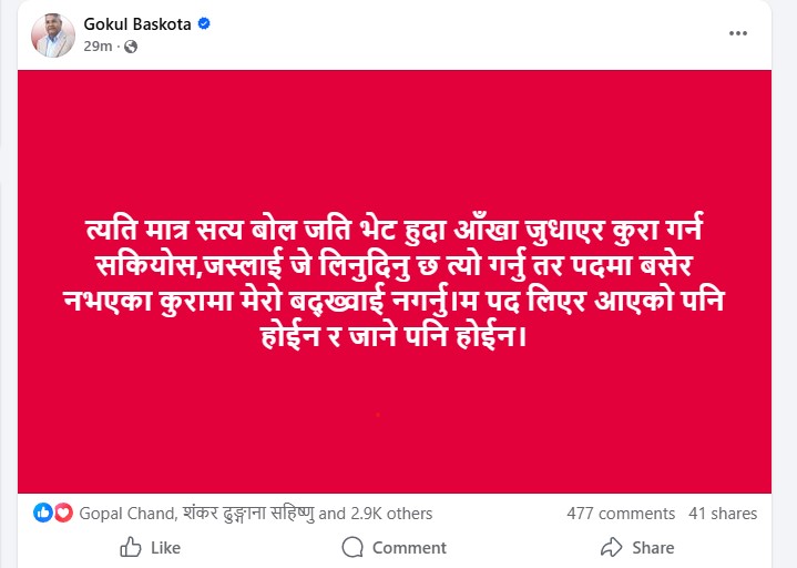 काभ्रे–२ बाट निरन्तर निर्वाचित हुँदै आएका केन्द्रीय सदस्य गोकुल बास्कोटाले टिकट नपाएपछि सामाजिक सञ्जालमार्फत तीखो प्रतिक्रिया जनाएका छन् । उनले आफ्नो चरित्रहत्या नगर्न चेतावनी दिँदै नेतृत्वप्रति असन्तुष्टि व्यक्त गरेका हुन् । ‘त्यति मात्र सत्य बोल, जति भेट हुँदा आँखा जुधाएर भन्न सकियोस्’, बास्कोटाले लेखेका छन्, ‘पदमा बसेर नभएका कुरामा मेरो बदख्वाही नगर्नू । म पद लिएर आएको होइन, न पदका लागि नै जाने हुँ ।’ यस पटक ओलीले बास्कोटालाई छाडेर काभ्रे–२ मा अशोककुमार ब्याञ्जु श्रेष्ठलाई उम्मेदवार बनाएका छन् । पछिल्लो समय ओलीका निर्णयहरूमाथि खुलेर प्रश्न उठाउँदै आएका बास्कोटालाई सोही कारण टिकटबाट वञ्चित गरिएको चर्चा एमाले वृत्तमा व्यापक छ ।