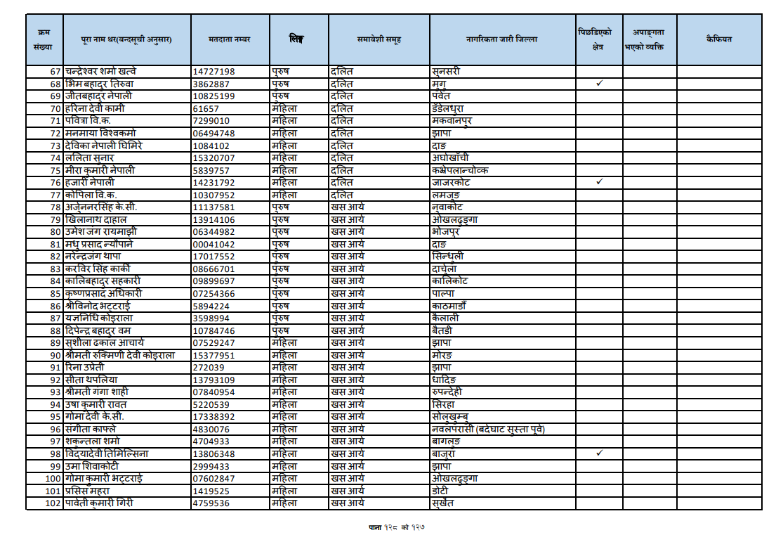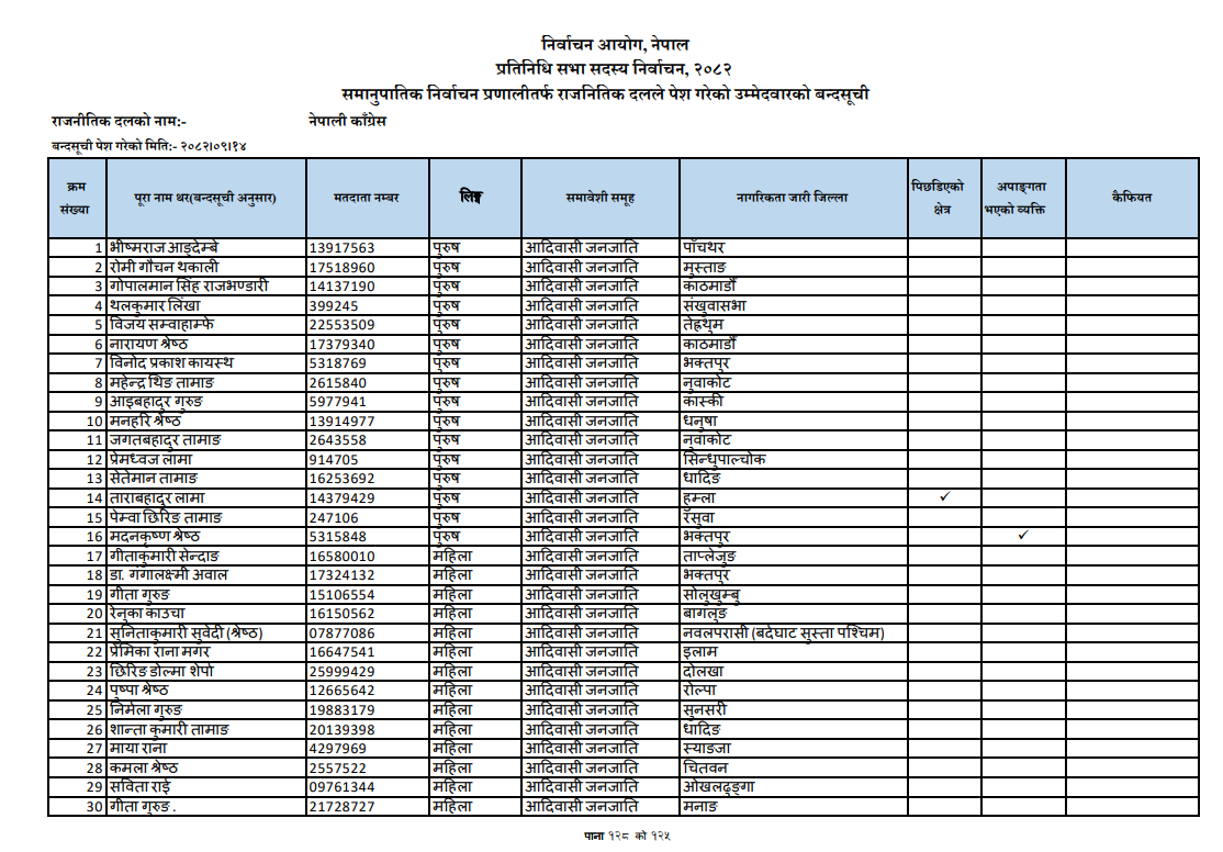 एक नेताले भने, ‘यदि अदालतले गगनजीको पक्षमा निर्णय गर्यो भने सबैलाई मिलाएर पार्टीलाई एकढिक्का राख्ने, संस्थापनको पक्षमा आयो भने गगनजीहरूलाई पनि समेटेर पार्टी एकढिक्का बनाइन्छ ।’ यसैबीच समानुपातिक उम्मेदवार सूचीमा नेपाली कांग्रेसका ११० जना उम्मेदवार सार्वजनिक भएका छन् । निर्वाचन आयोगले आइतबार राति बन्दसूची जारी गरेको हो । सूची अनुसार विभिन्न जात, समुदाय र लिङ्गको प्रतिनिधित्व सुनिश्चित गरिएको छ ।