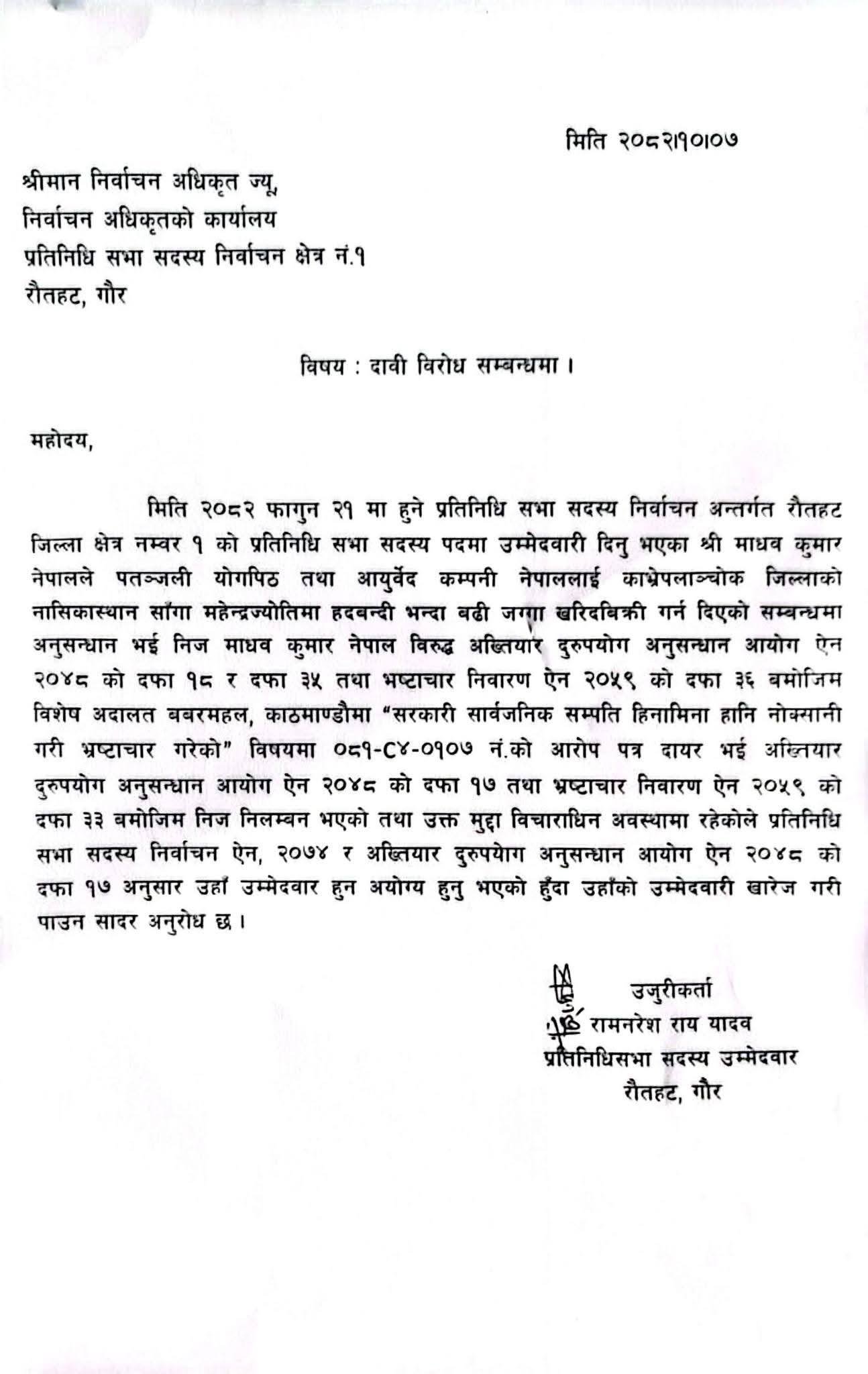 यता, उनको पुनः उम्मेदवारी दर्ताविरुद्ध निर्वाचन आयोगमा उजुरी पनि परेको छ । रौतहट–१ कै उम्मेदवार राम नरेश राय यादवले पतञ्जली जग्गा प्रकरणमा मुछिएका नेपाल उम्मेदवार बन्न अयोग्य रहेको दाबी गर्दै उम्मेदवारी खारेजीको माग गरेका हुन् । उजुरीमा अख्तियार दुरुपयोग अनुसन्धान आयोग ऐन २०४८ को दफा १७ र भ्रष्टाचार निवारण ऐन २०५९ को दफा ३३ उल्लेख गर्दै, मुद्दा विचाराधीन र निलम्बनको अवस्थामा रहेका व्यक्तिले प्रतिनिधि सभा सदस्य निर्वाचन ऐन २०७४ अनुसार उम्मेदवार बन्न नपाउने तर्क प्रस्तुत गरिएको छ । माधव नेपालको उम्मेदवारी कायम रहने वा खारेज हुने भन्ने विषय अब निर्वाचन आयोगको निर्णयमा निर्भर छ । तर, उम्मेदवारी स्वीकृत भए पनि जितपछिको भूमिकामा गम्भीर कानुनी अवरोध रहने भएकाले रौतहट–१ को निर्वाचन मात्र होइन, समग्र राष्ट्रिय राजनीतिमा समेत यो विषय चर्को बहसको केन्द्र बनेको छ ।