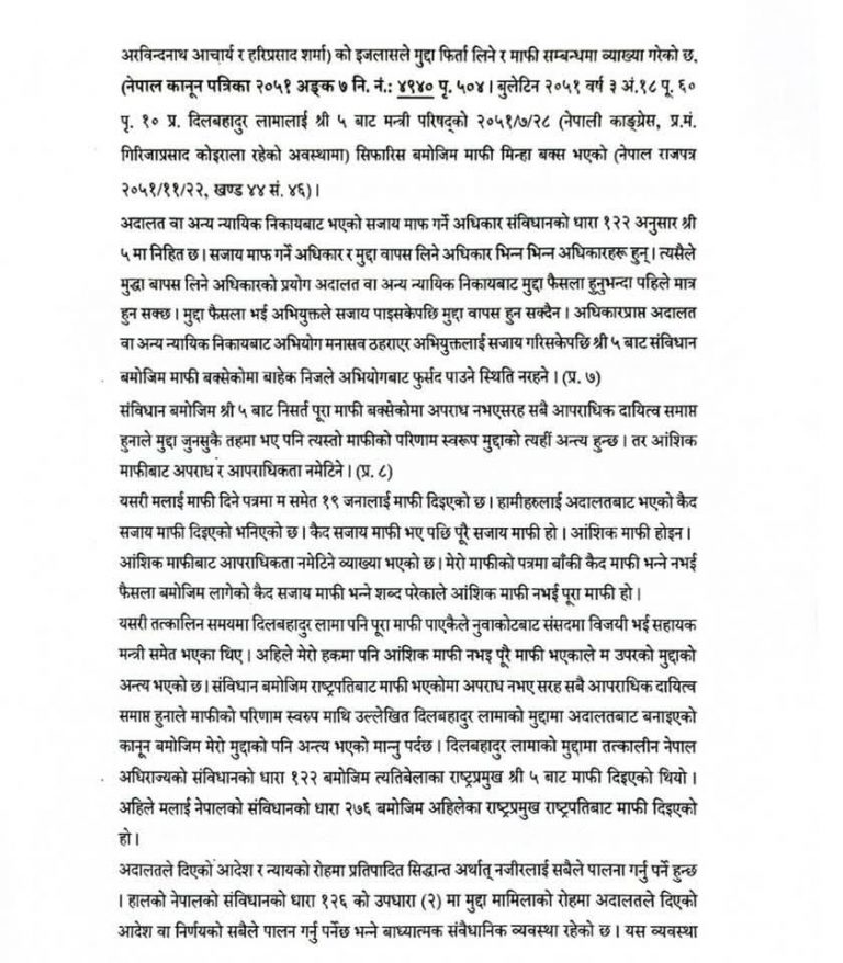 स्पष्टीकरणमा चौधरीले आफूले संविधान बमोजिम आंशिक होइन, पूर्ण माफी पाएको दाबी गरेका छन् । उनले राष्ट्रपतिबाट प्राप्त माफीपत्रमा आफूसहित १९ जनालाई माफी दिइएको उल्लेख गर्दै ‘फैसला बमोजिम लागेको कैद सजाय माफी’ भन्ने शब्दावली प्रयोग भएकाले यो पूर्ण माफी भएको स्पष्ट पारेका छन् । उनको भनाइ छ, ‘कैद सजाय माफी भएपछि त्यो पूरै सजाय माफी हो । आंशिक माफी भएको भए बाँकी कैद माफी भन्ने शब्द प्रयोग हुने थियो । मेरो हकमा त्यस्तो नभएकाले आपराधिकता समाप्त भइसकेको छ ।’