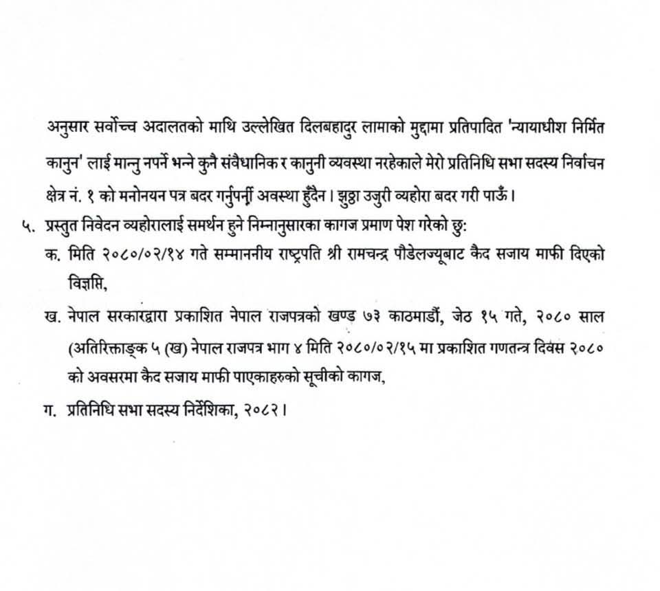 काठमाडौं । कैलाली निर्वाचन क्षेत्र नम्बर–१ बाट प्रतिनिधि सभा सदस्यका लागि उम्मेदवारी दिएका नागरिक उन्मुक्ति पार्टी (नाउपा) नेपालका संरक्षक रेशम चौधरीको उम्मेदवारी कायम रहने वा खारेज हुने विषयमा आजै निर्णय आउने भएको छ । माघ ६ गते उम्मेदवारी दर्ता गरेका चौधरीविरुद्ध माघ ७ गते उजुरी परेको थियो । उजुरी परेपछि उनी आज निर्वाचन अधिकृत कार्यालय पुगेर पाँच बुँदे लिखित स्पष्टीकरण प्रस्तुत गरेका हुन् । निर्वाचन अधिकृत कार्यालय स्रोतका अनुसार उनको स्पष्टीकरणपछि उम्मेदवारीको वैधताबारे आजै टुंगो लाग्नेछ ।